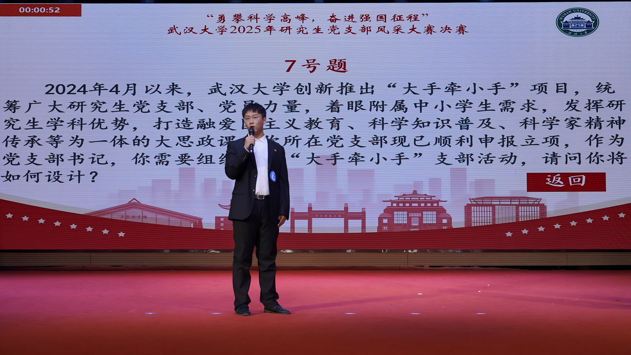 在实操风采展示环节,针对抽取的题目“如何设计组织一次‘大手牵小手’支部活动”,地理科学与国土资源系研究生第五党支部书记何金强同志进行了精彩回答。他从活动主题立意、流程设计、实效保障三个维度展开,明确了“支部党员牵头、联动中小学、立足本土地理资源”的实施路径。回答逻辑清晰、重点突出、兼具创新性与可操作性,充分展现了其扎实的党建工作功底、清晰的统筹规划思路与务实的服务群众意识。