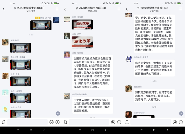 黄玉兰表示,“学史明理、学史增信、学史崇德、学史力行”。学习党史,牢记党的历史经验,可以让我们更好地把握现在,展望未来。历史就像一本教科书,我们的党史就是中华民族走出劫难,挺起脊梁做人的鲜活教材。其中的经验和智慧都需要我们深刻领会,从而更好地完成继往开来的任务,更好地为建造更好的明天贡献一份自己的力量。刘越表示,党史是我党不断发展发展的印记,在时间和空间不断交织中进行也在不断地实践中丰富自己的认识。在党史的不断发展中,一方面是发掘新的史料,还历史本来面目,另一方面用新的认识高度和角度去诠释先辈们付出的努力,从而丰富我们的“营养剂”。魏子婷表示,在观看了“伟大精神谱系,百年奋进风华”直播后,我深受触动。无论在工作还是生活中,我们应当谨记“为人民服务”的根本宗旨,完成好自己的本职工作,传承民族精神,践行社会主义核心价值观,尽自己最大的能力为祖国、为党、为社会、为人民做出贡献。