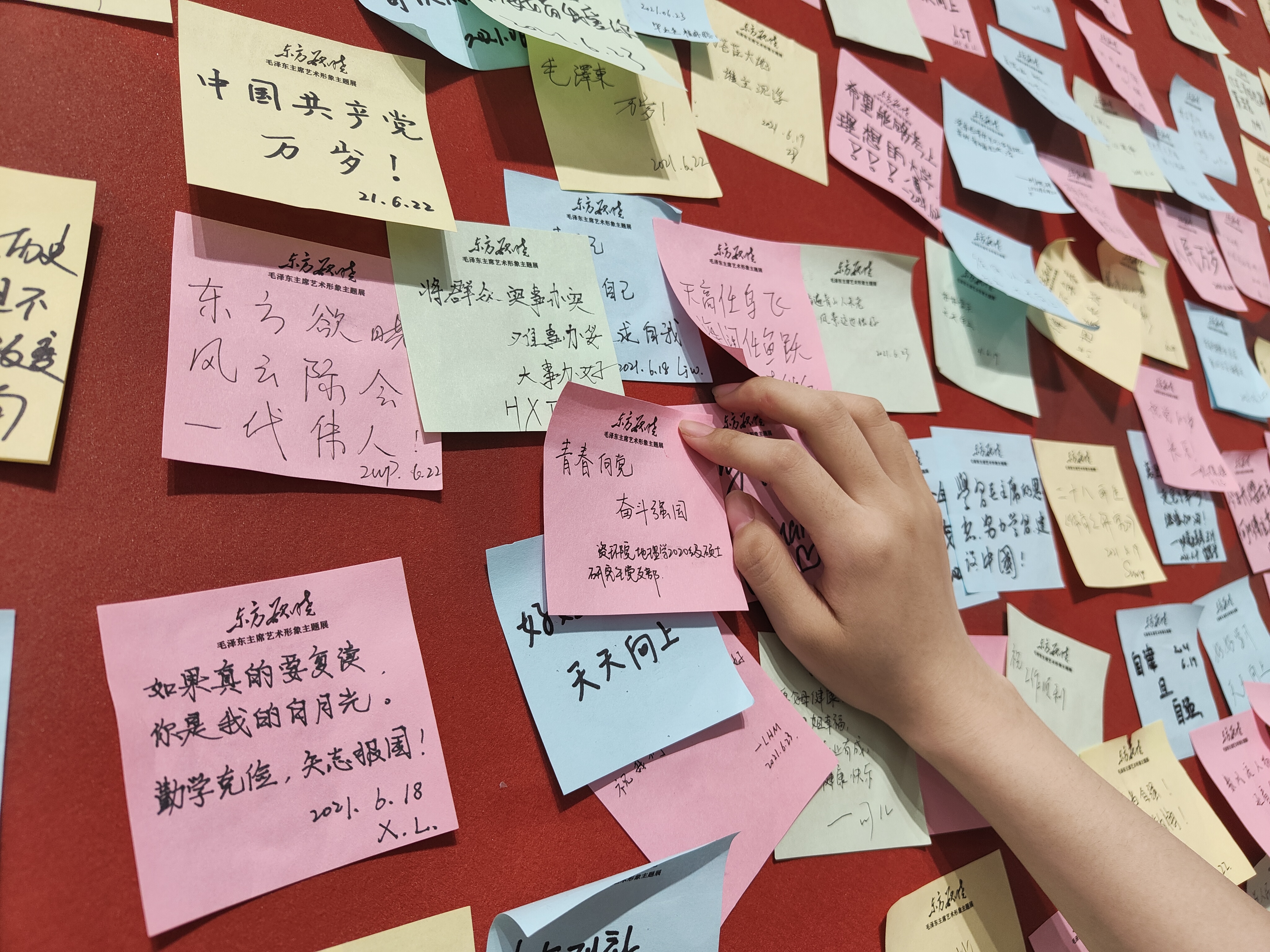 接见“四校”学生,与学生们亲切交谈。展区陈列了许多珍贵的文物和照片,支部同志们认真参观,仿佛置身历史长流中,一点一滴追忆以毛泽东为首的革命先驱者们同心同德、并肩战斗、改天换地创建新中国的峥嵘岁月。不少同志深受感触,在“跟着毛主席读书”互动区留下了自己对未来的寄语。