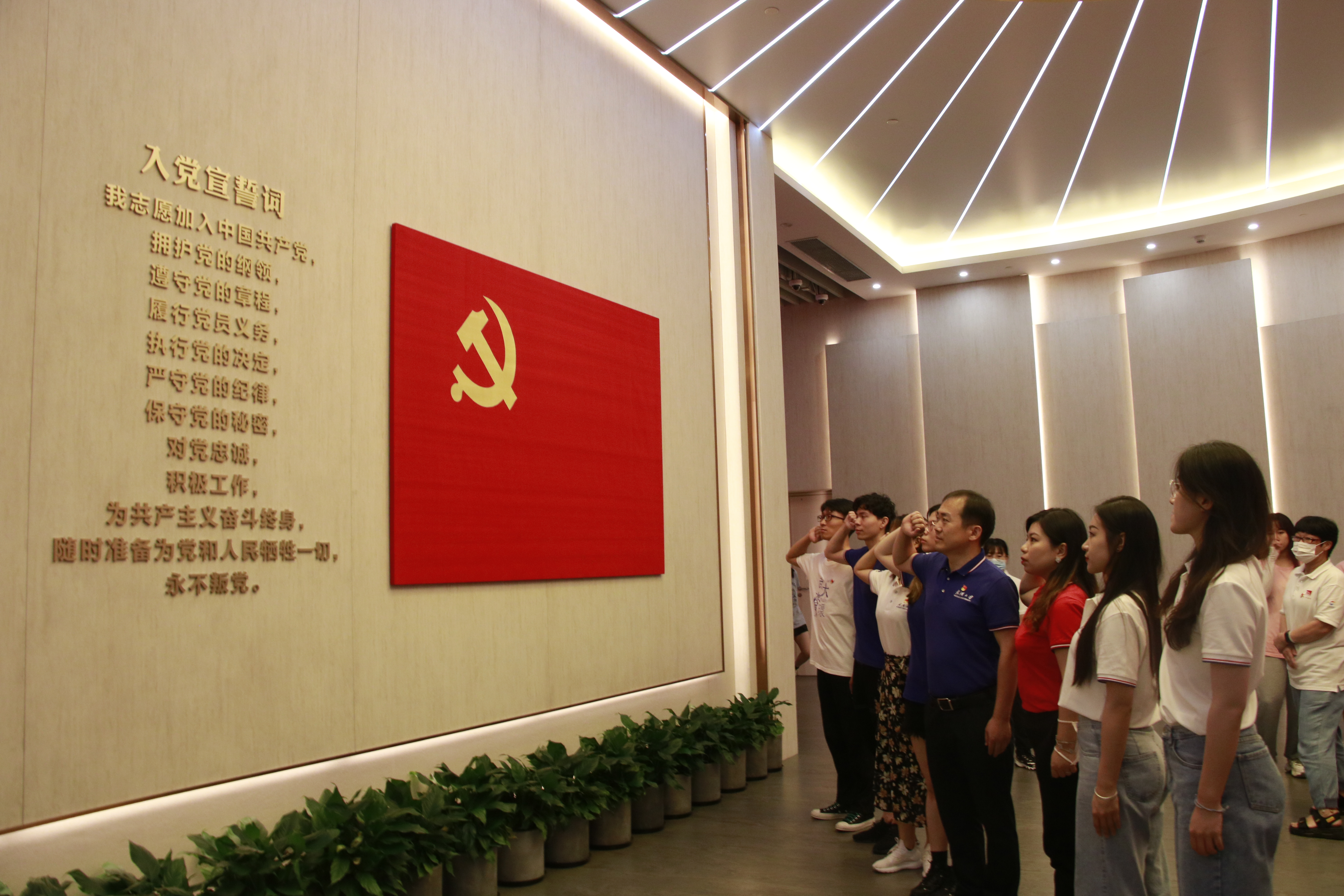 纪念馆宣誓厅,悬挂着巨幅中国共产党党旗。面对党旗,雷起宏老师带领研究生党员同志一起重温入党誓词。铿锵有力的宣誓声响彻大厅,让现场所有人都深受感染,仿佛回到了那个风雨如磐的年代。