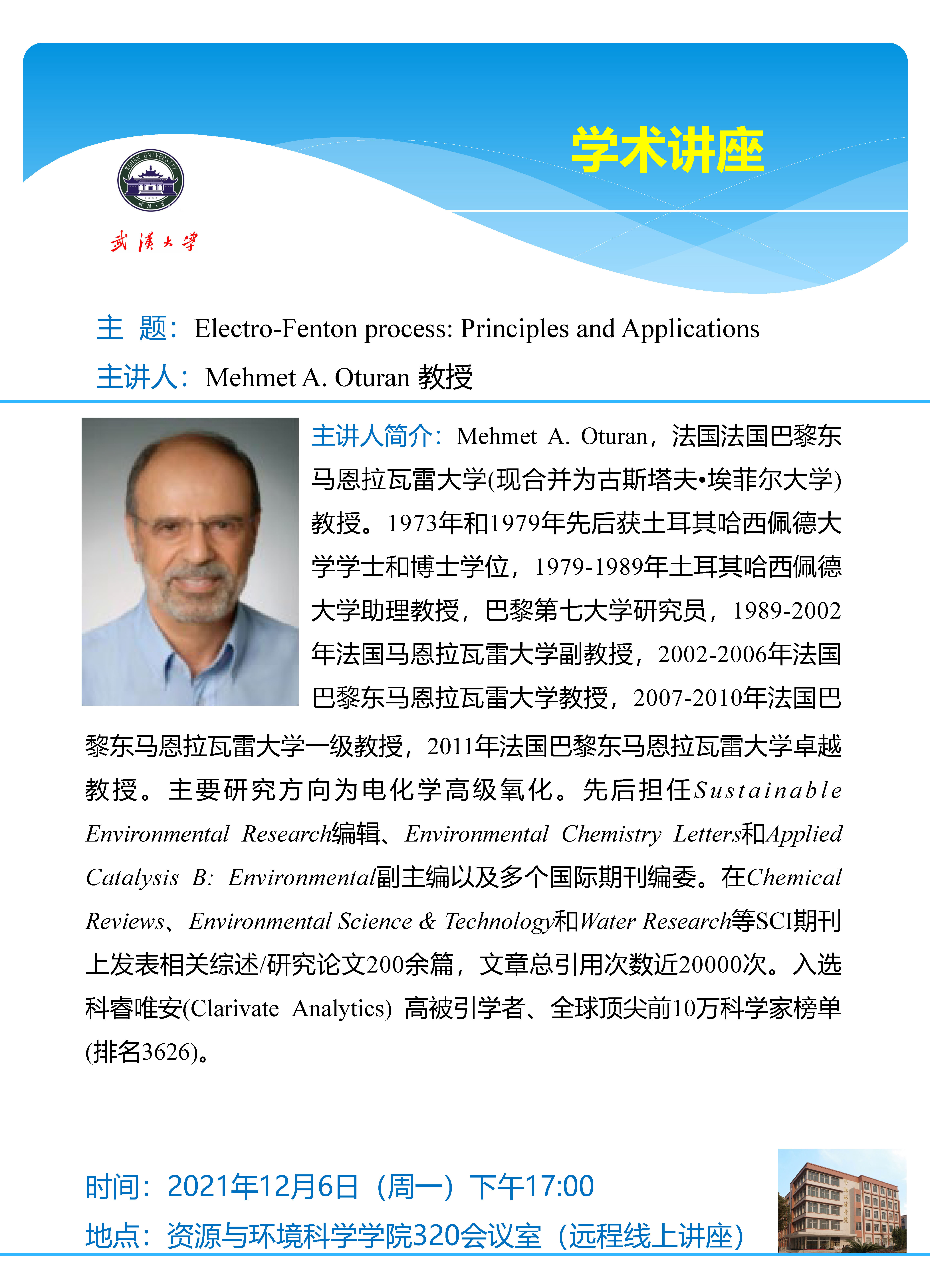 12月6日 珞珈资源环境讲坛第56讲 Electro-Fenton process: Principles and Applications