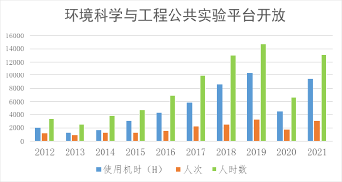 环境科学与工程公共实验平台本着“统一管理,开放使用”原则,平台内仪器均实行院内开放预约培训使用。平台近十年开放时长、人次及人时数逐年增加,近五年平台每年平均使用机时约7700小时,人时数每年约11500人次*小时,提高了仪器设备的使用率,为本科教学、研究生教学以及教师科研提供了高质量的服务,为学科建设提供有力支撑,有效的满足了学院教学和科研的仪器设备需要。