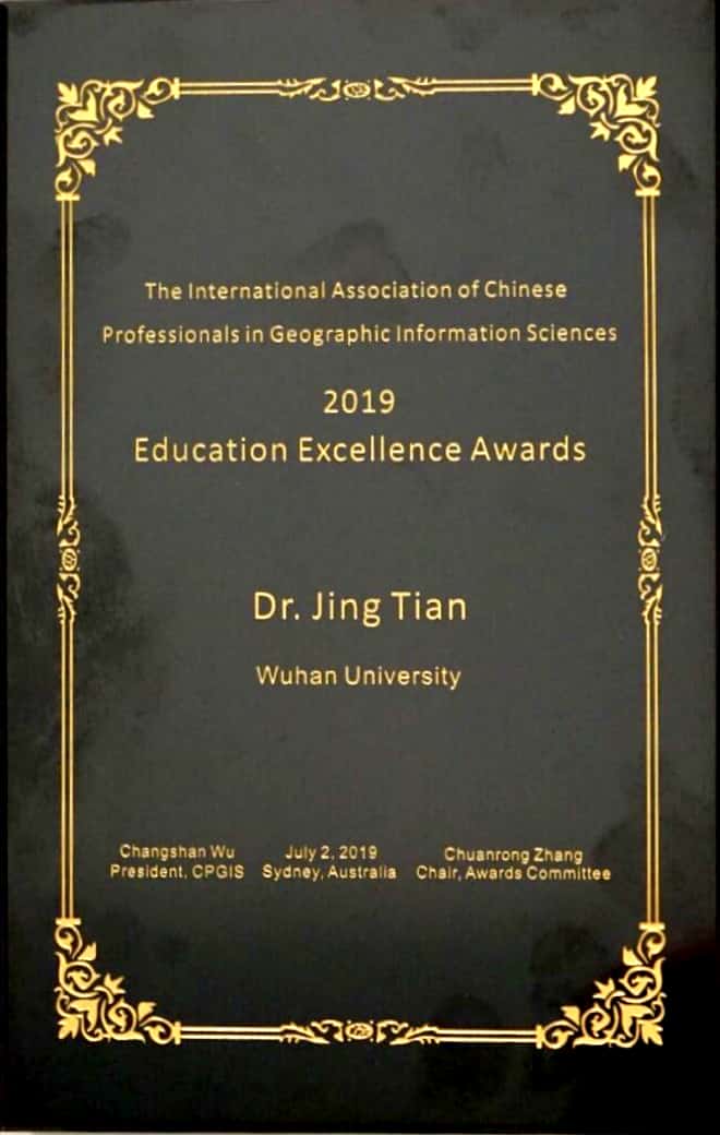 田晶老师与加州大学圣芭芭拉分校的Alan Murray教授同时获得CPGIS教育卓越奖(CPGIS Education Excellence Awards)。