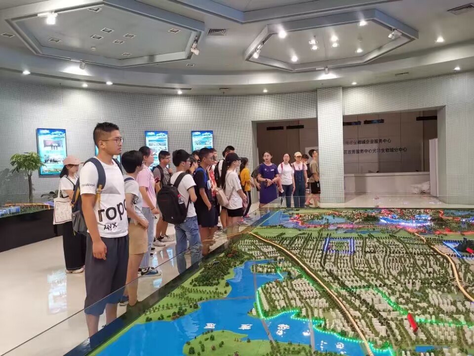 结合课程内容城市产业空间学习内容,课程组带领同学们前往位于武汉东湖国家自主创新示范区的光谷生物城(国际生物产业基地)。同学们首先通过光谷生物城总体规划布局沙盘了解园区的发展现状和规划,并在光谷生物城教育成果展示交易馆的工作人员介绍下深入了解入驻生物城中相关生物医药创新企业的技术研发,企业发展和园区配套金融服务机制等。