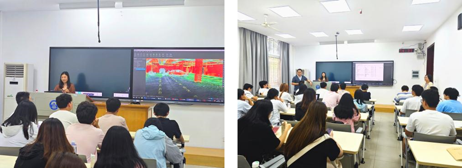 本次课程采取课内教学与课外实操相结合的策略进行教学,旨在为学生提供全面深入的学习体验。在课内教学部分,王成和霍兵兵老师不仅为同学们讲解了激光雷达与影像建模的技术原理,介绍了国内外激光扫描与影像建模产品以及由大势智慧自主研发的大势鹰眼和智影R100系列产品,还展示了生动的实景三维建模案例,让学生们对三维建模技术有了初步的体会。