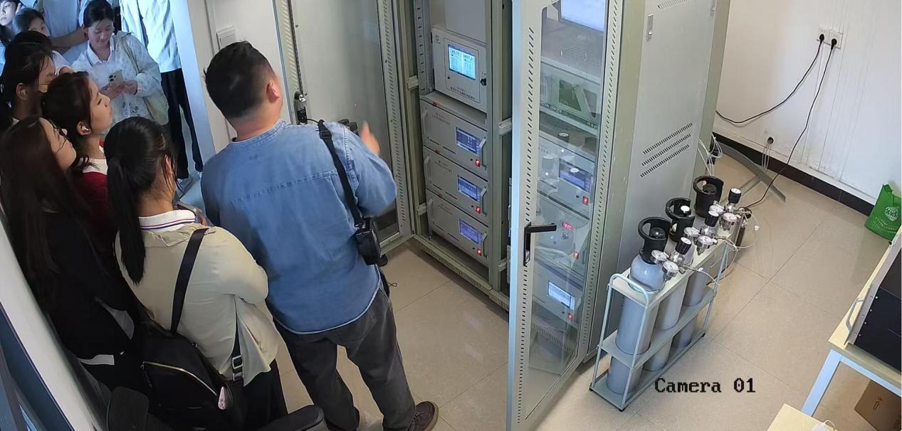 在实验教学中心吴东星老师的带领下,同学们参观了监测站的大气污染物观测平台,并对其主要大气污染物如PM2.5、PM10、SO₂、CO、NOₓ、O₃等的在线自动监测设备进行了深入了解。吴老师对各类仪器的构造、工作原理、校准流程以及数据的采集与处理方法进行了详尽的阐释,旨在帮助学生从根本上掌握环境监测数据的科学性和可靠性。