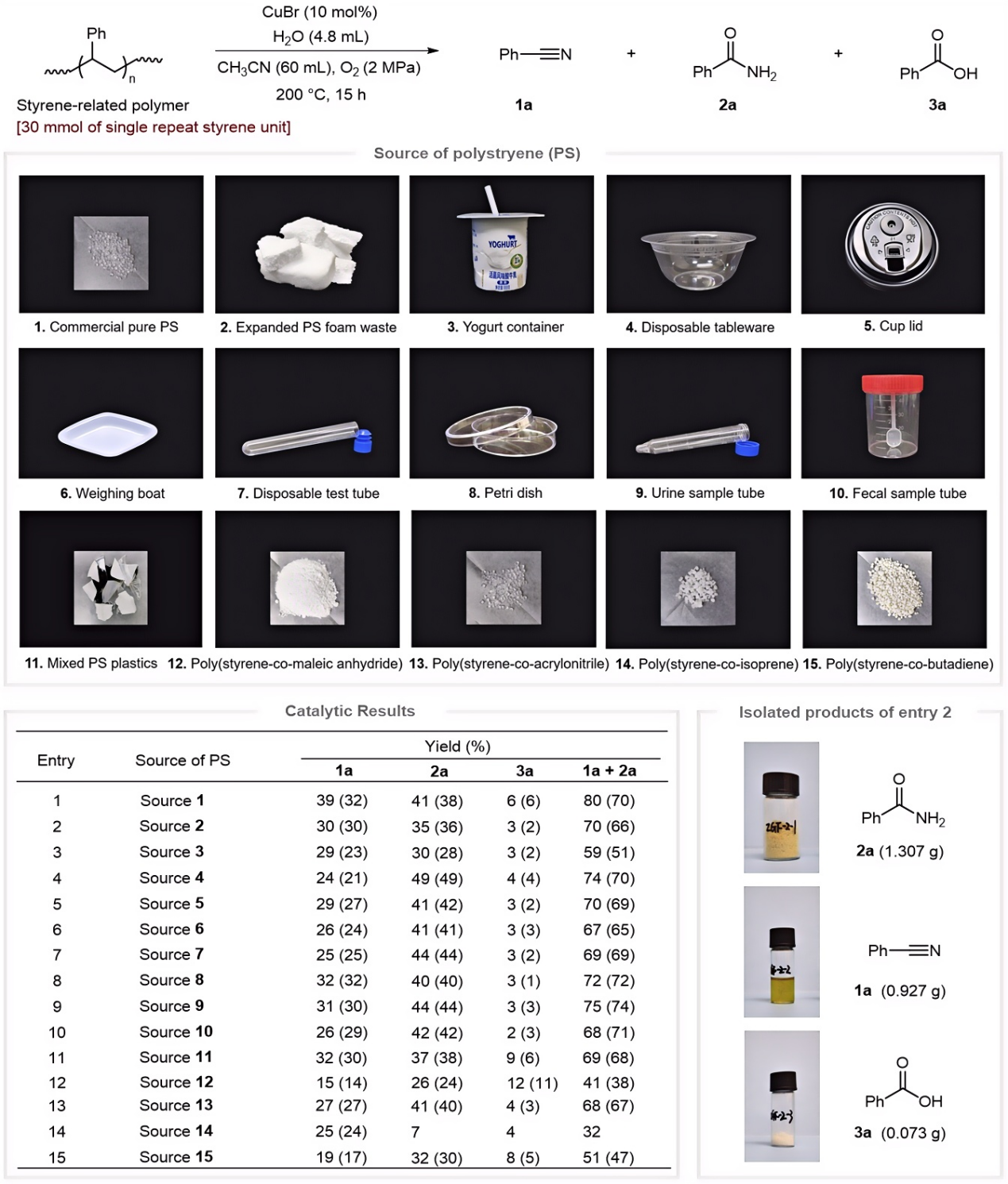 针对聚苯乙烯塑料化学降解难、反应条件苛刻、降解产品经济效益低、现有技术规模化难的问题,黄志良课题组提出了预氧化诱导氮组装的新型降解策略,利用传统热催化技术,实现了聚苯乙烯塑料氧化降解制备芳香含氮化合物苯甲腈及苯甲酰胺。值得一提的是,该方法不仅可获得高价值、高需求的化学品,而且可嫁接在现有的石油化工设备上进行放大生产,具有良好的工业应用前景。