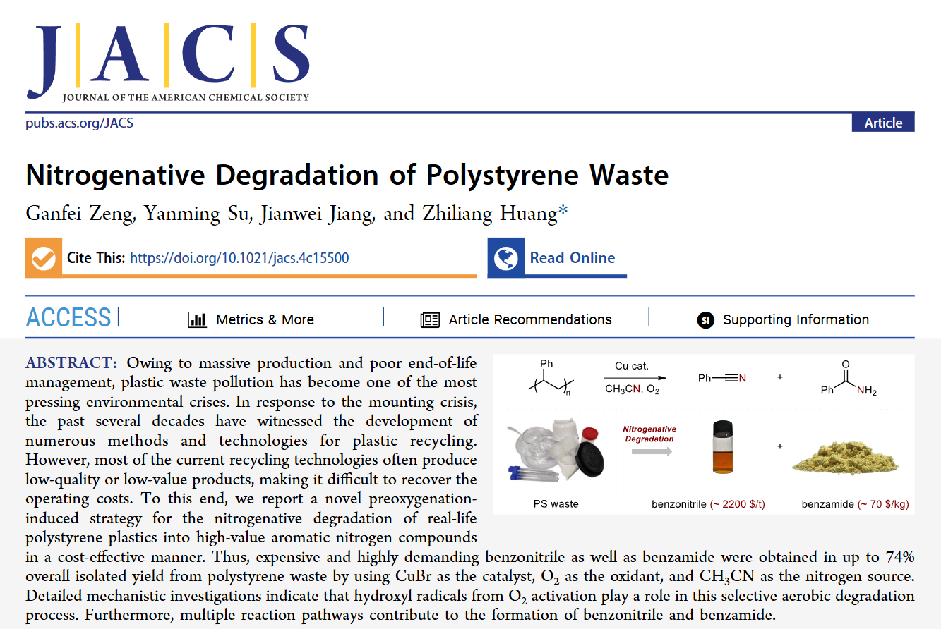 文章信息:Ganfei Zeng, Yanming Su, Jianwei Jiang, and Zhiliang Huang*, Nitrogenative Degradation of Polystyrene Waste, J. Am. Chem. Soc. 2025, 10.1021/jacs.4c15500.