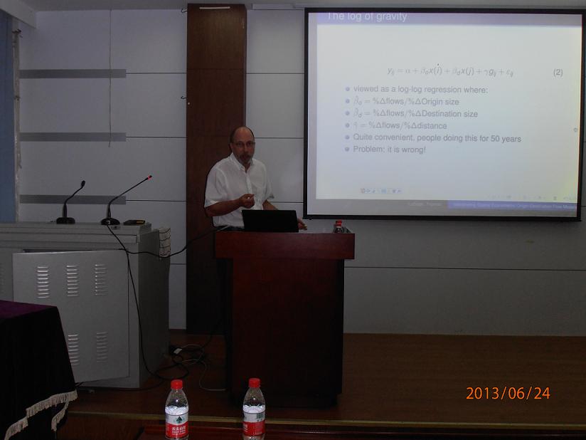 ,并作了题为“Interpreting Spatial Econometric Origin-Destination Flow Models”的学术报告。Lesage教授针对传统的引力模型在研究网络流分析时忽略节点邻域间流影响的缺陷,提出了利用空间自回归模型进行引力模型的改进,并以居住-就业网络流为例说明了模型的合理性。Lesage教授的报告深入浅出,引人入胜,澳门美高梅