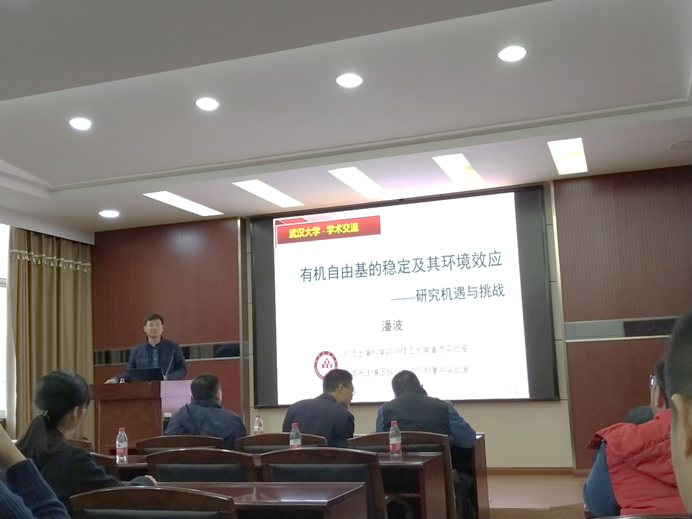 师生进行学术交流,并作了题为“有机自由基的稳定及其环境效应”的报告。学院副院长汪的华教授,环境科学与工程系主任毛旭辉教授,副主任邓红兵教授,李进军教授,朱联东教授,张旭副教授及我系研究生参加了学术交流活动,报告会由邓红兵教授主持。