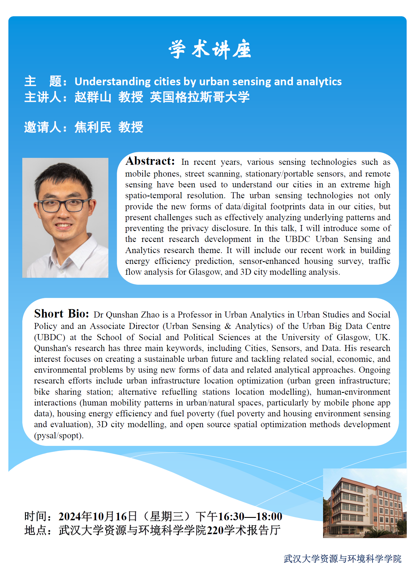 【学术讲座】10月16日下午英国格拉斯哥大学赵群山教授 Uderstanding cities by urban sensing and analytics