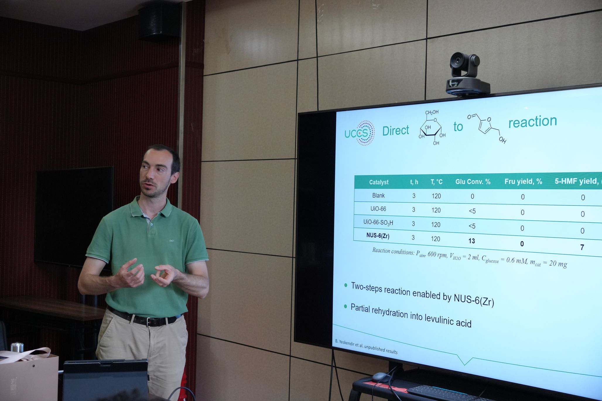 在学院期间,DHAINAUT研究员分别于6月3日和6日作了两场场内容丰富的学术报告,其报告题目分别为“Shaping of MOFs catalysts — introduction and conventional methods”和“Preparation of single-atom catalysts derived from MOFs catalysts”。在这两场报告中,DHAINAUT Jérémy研究员聚焦金属有机框架(MOFs)材料在环境催化中的工程化应用挑战,通过颗粒化/块体化/膜状化成型技术(孔隙率降幅≤10%且机械性能提升)解决粉末材料工业适配瓶颈,并以此类成型MOFs为前体,经配体-金属比精准调控及600–800°C惰性气氛煅烧实现单原子催化剂的原位合成,结合HAADF-STEM/XPS/EXAFS多尺度表征验证原子级活性位点,最终为高级氧化技术提供兼具高催化效率与工程适用性的解决方案。报告会后DHAINAUT研究员还与环境科学与工程系师生进行了讨论和交流。