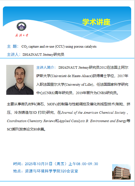 【学术讲座】10月31日上午 法国里尔大学 DHAINAUT Jérémy研究员 CO2 capture and re-use (CCU) using porous catalysts