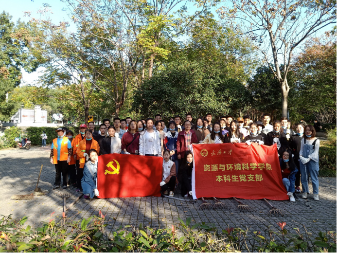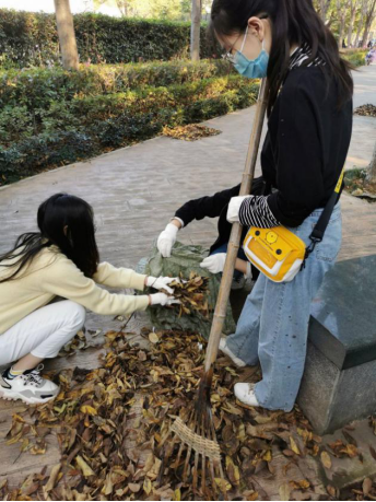 首先,园林中心的杨队长组织同学们每人领取了一种劳动工具。然后,他耐心地为大家讲解工具的正确使用方法。随后,他把环卫工人和同学们大致分成几个小组,每组分不同的片区进行清扫。汉林广场内的落叶乔木很多,正值秋季,遍地的落叶与草丛间夹杂的白色垃圾,同学们感受到了此次劳动任务的艰巨。但是,大家依然斗志满满!党员同志们拿着不同的劳动工具,热火朝天地干了起来。有的用夹子去捡草丛深处的白色垃圾,有的用耙子将草丛里的落叶耙出来,有的则用扫帚将前面同学从草丛耙出来的落叶清扫到一堆,然后装进麻袋里。在劳动的过程中,党员们也遇到了一些困难。比如:麻袋口很软,又比较小,不太方便把成堆的落叶扫入麻袋中。于是,有同学直接用双手将枯枝烂叶捧进麻袋里。下午3:30之后,武大一附小的孩子们放学了,大人和孩子在汉林中穿梭,也增加了清扫的难度。马老师不断地提醒党员们注意避让行人,组织大家在道路的一边尽快清理。下午四点左右,汉林广场一带白色垃圾基本被清理完,从树丛里清理出来的落叶也被大家装了一麻袋又一麻袋。最后,由男生们将落叶搬运到垃圾车旁,装满了一个大垃圾车。落叶装车完毕,工具全部归还,活动也宣布结束。