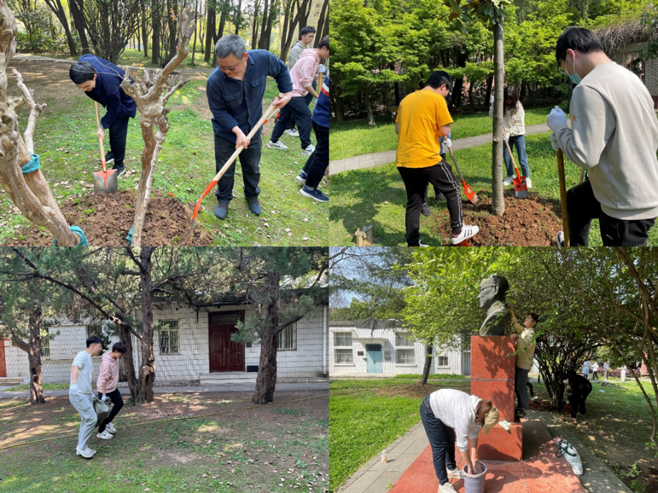 随后三个支部的同学们按要求分组进行松土护树、清扫公共设施。每棵树木由四个人负责松土施肥,按照园林中心工作人员的建议,先对一排树木进行松土施肥后再对新的一排树木松土施肥。在修剪树枝,浇水,擦拭长椅走廊,护绿清洁完整个天文台后,同学们主动回收使用的工具清扫活动过程中产生的垃圾