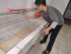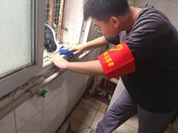 清理完宿舍院前的垃圾和落叶后,同学们进入宿舍内部,帮助清洁阿姨清洗洗漱间的水槽,窗框等积灰比较严重,长期没有清理的地方。几位男同学挽起袖子,用抹布和洗洁精仔细擦拭水池边沿的各种污渍。