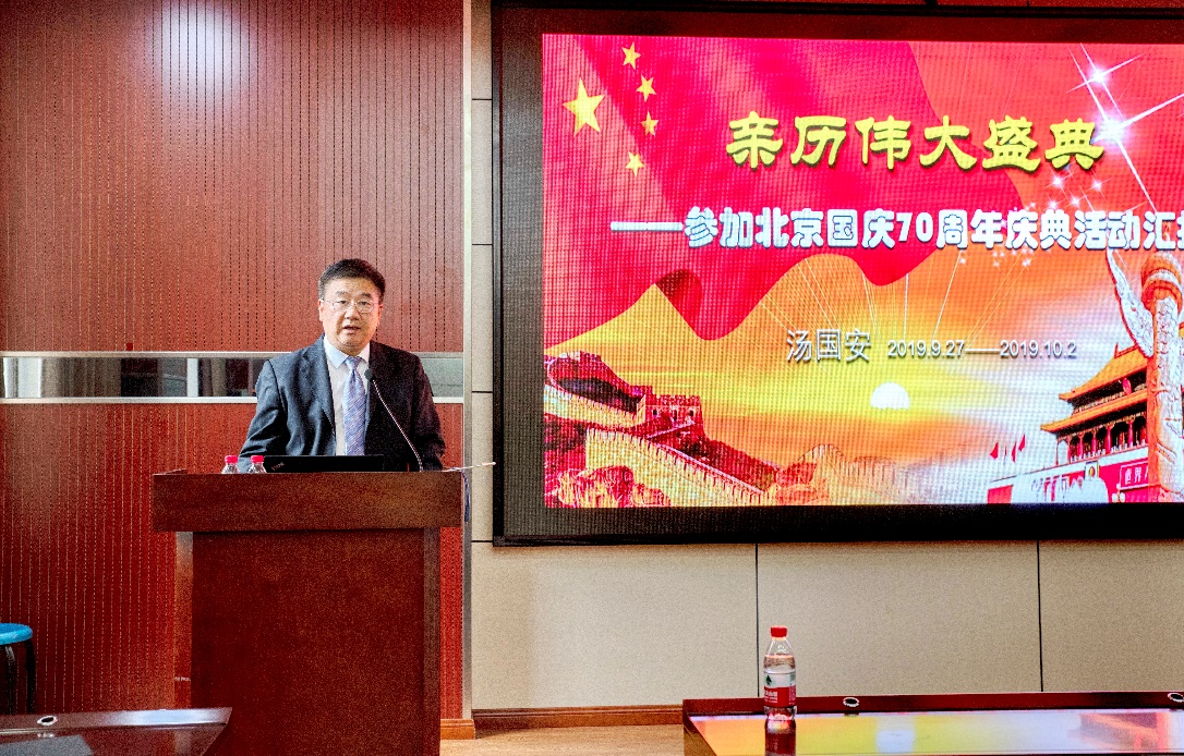 9月28日至10月1日期间,汤国安教授作为海外优秀留学归国人员代表受邀赴京参加了新中国成立70周年国庆系列活动,包括参观“伟大历程辉煌成就——庆祝中华人民共和国成立70周年大型成就展”,观看大型音乐舞蹈史诗“奋斗吧 中华儿女”,参加天安门广场的阅兵观礼以及群众联欢晚会等多个盛大活动。报告会上,汤国安教授从他当年在奥地利萨尔茨堡留学期间发起组织华人华侨国庆活动的感人故事讲起,多视角讲述了亲历国庆70周年庆典活动的盛况和体会。报告现场感和画面感强,信息量大,精彩纷呈,处处洋溢着浓浓的爱国情怀。汤国安教授亲身见证了祖国伟大盛典,让他感到无比的骄傲与自豪。报告会现场的师生也犹如身临其境,感受到新中国从站起来,到富起来、强起来的宏伟历程。