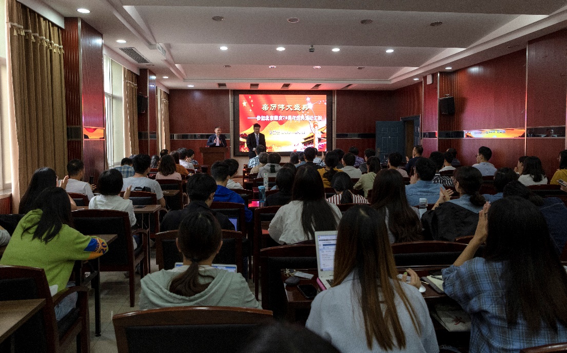 师生分享他亲历70周年国庆盛典的所见所思所感。院党委书记刘兴国主持报告会。