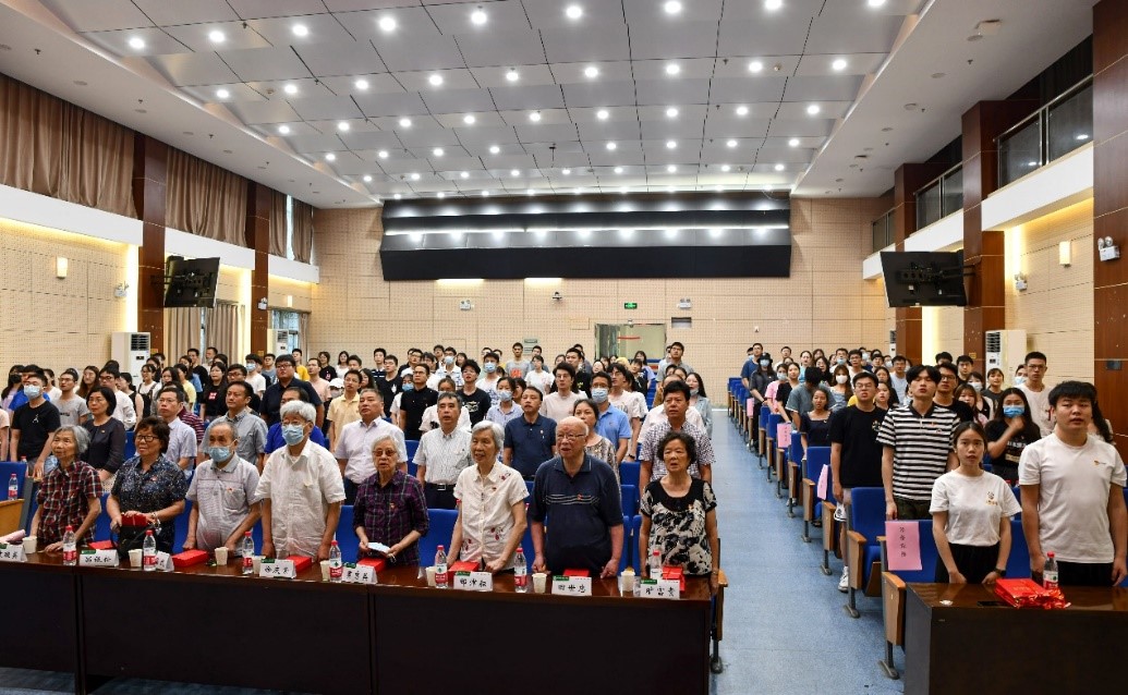 在全体起立致敬、热烈鼓掌下,获得“光荣在党50年”纪念章的老党员登台,由学院党委书记刘兴国和院长杜清运为他们佩戴上闪亮的纪念章,年轻的学生党员们向他们献上鲜花,表达对老同志们的崇高敬意。年近九旬的纪念章获得者袁璇英同志作了发言。她以自己的一生经历为轴回顾了党的百年奋斗史,为大家上了一堂生动鲜活的党课。她以缅怀父亲为始追忆先烈,她的父亲作为早期的共产党员,年仅24岁英勇就义;她以启发新党员作尾激励后辈,希望年轻一代党员能够接过接力棒,奋勇前行。