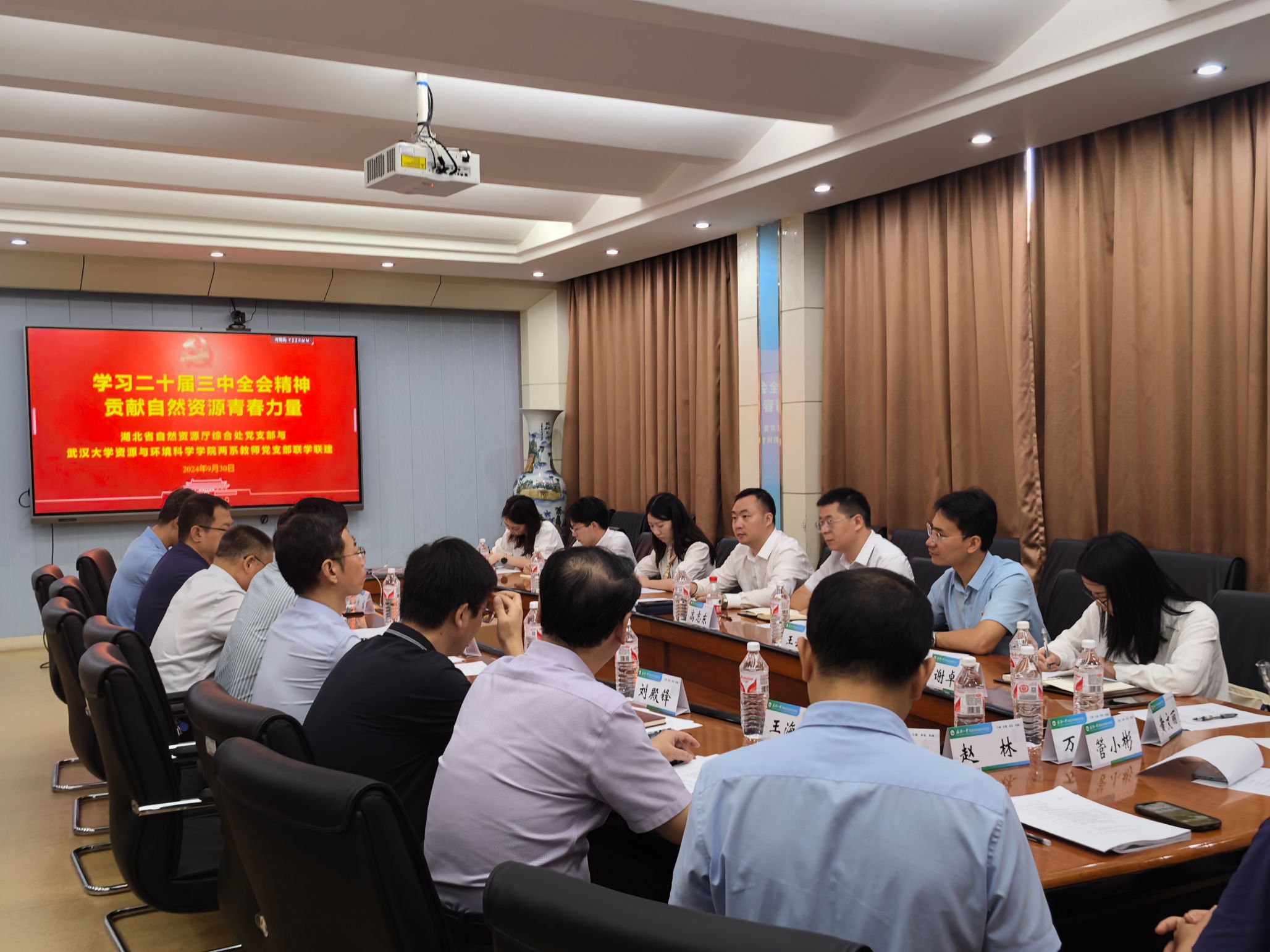 930日上午,湖北省自然资源厅综合处党支部与澳门美高梅 地理信息与地图科学系教师党支部、地理科学与国土资源系教师党支部联合开展了联学联建活动。活动以“学习党的二十届三中全会精神,贡献自然资源青春力量”为主题,深入学习贯彻习近平新时代中国特色社会主义思想和党的二十届三中全会精神,加深交流、开阔思路、共谋发展,为推动自然资源事业高质量发展贡献力量。省自然资源厅综合处处长王磊带领支部党员来澳门美高梅 参加了活动,院党委书记刘兴国、院长沈焕锋和两个系支部的党员参加学习交流。