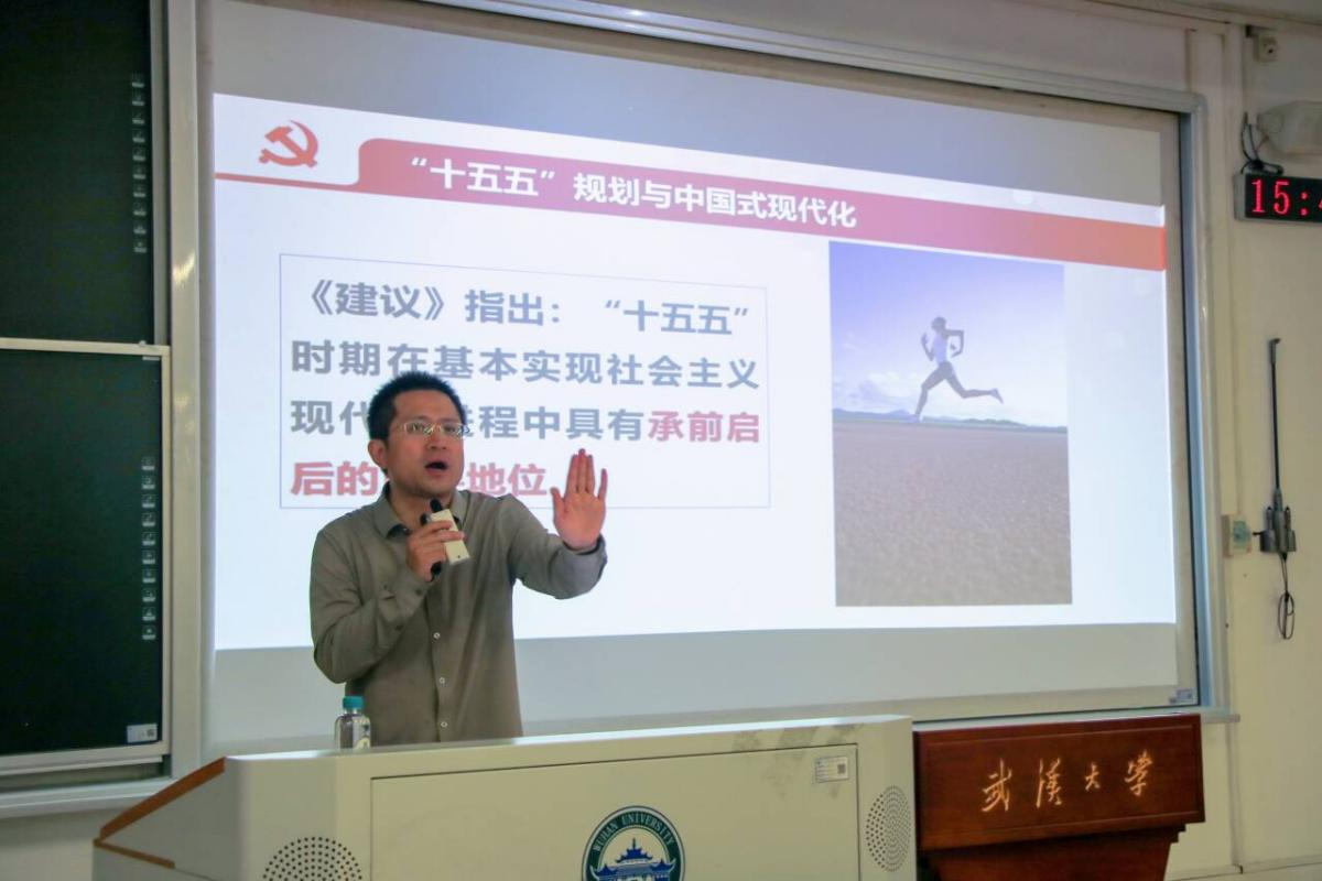 周绍东教授以《“十五五”规划与中国式现代化——深入学习贯彻党的二十届四中全会精神》为主题,围绕“六个坚持”核心要义系统阐释:一是“坚持以人民为中心”,回顾了新中国成立以来,民生保障从“解决温饱”到“共同富裕”的历史演进,结合“十五五”规划民生领域目标,阐释“人民至上”的实践逻辑;二是“坚持有效市场与有为政府相结合”,对比不同发展阶段市场与政府作用特征,以合肥政府投资长鑫存储、扶持蔚来汽车的实践,解读“十五五”时期市场活力与政策保障的协同路径;三是“坚持统筹发展与安全”,从历史上粮食安全、能源安全问题切入,结合“十五五”规划的安全体系建设要求,以火神山医院建设为例,分析特殊时期的中国智慧;四是“坚持高质量发展”,梳理了我国从“高速增长”到“高质量发展”的转型历程,以武汉汽车产业升级、“天河-花湖”机场建设等案例,解读“十五五”时期现代化产业体系构建目标;五是“坚持全面深化改革”,回顾了新时代改革举措意义,结合“十五五”规划中的开放改革部署,总结实践经验;六是“坚持党的全面领导”,立足党的领导作用,强调其在“十五五”规划编制实施中的根本保证,提醒青年党员牢记“党旗所指就是奋斗方向”。