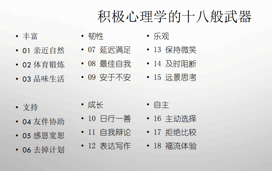 老师重点丰富生活体验、提高心理韧性、进行乐观训练、寻求社会支持、追求自我成长以及强调自主选择这六个层面,介绍了应对压力的积极心理学“十八般武器”