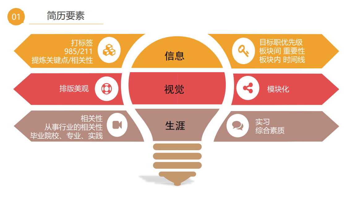 如教育经历应该按最高学历在前,即模板间按重要性排序;荣誉奖项中可去除与岗位无太大关联的奖项,按荣誉称号/竞赛奖项等级进行分类;经历中,应多用动词、数次量化工作,运用STAR发展来体现个人能力。