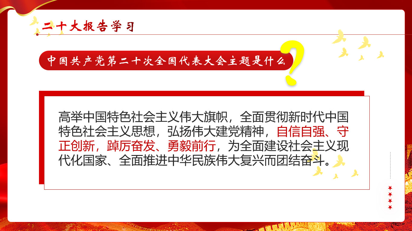 中国共产党第二十次全国代表大会于2022年10月16日上午10时在北京人民大会堂开幕。中国共产党第二十次全国代表大会,是在全党全国各族人民迈上全面建设社会主义现代化国家新征程、向第二个百年奋斗目标进军的关键时刻召开的一次十分重要的大会。本次二十大的主题是高举中国特色社会主义伟大旗帜,全面贯彻新时代中国特色社会主义思想,弘扬伟大建党精神,自信自强、守正创新,踔厉奋发、勇毅前行,为全面建设社会主义现代化国家、全面推进中华民族伟大复兴而团结奋斗。十年来,我们党和国家经历了三件大事:一是迎来中国共产党成立一百周年,二是中国特色社会主义进入新时代,三是完成脱贫攻坚、全面建成小康社会的历史任务,实现第一个百年奋斗目标。这是中国共产党和中国人民团结奋斗赢得的历史性胜利,是彪炳中华民族发展史册的历史性胜利,也是对世界具有深远影响的历史性胜利。