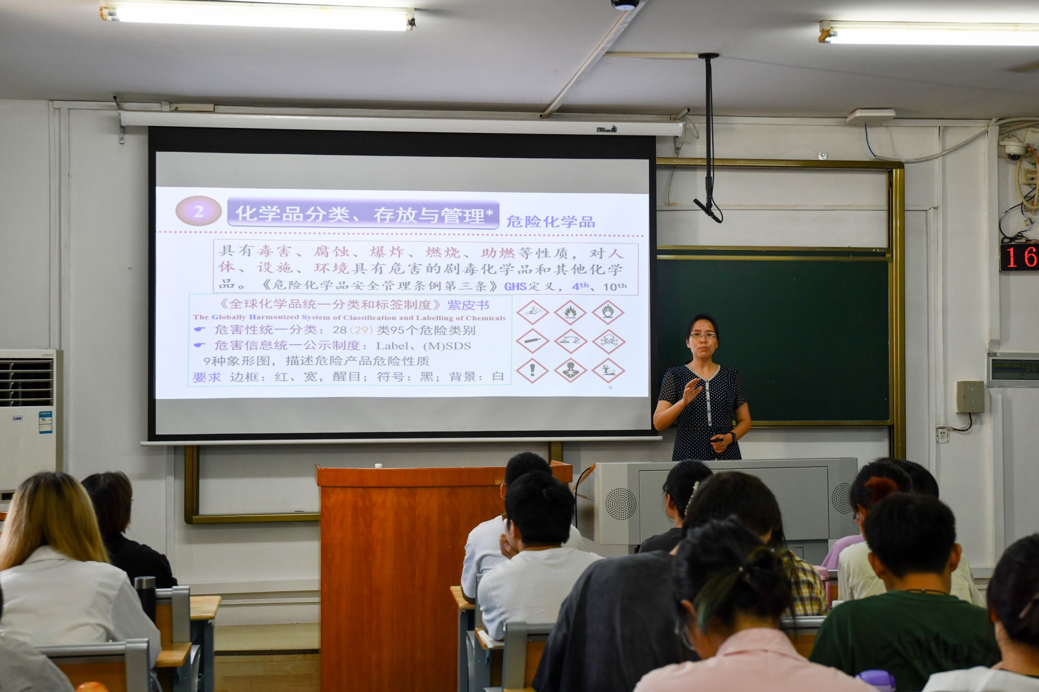 化学与分子科学学院教师、实验室安全督导组专家赵发琼教授讲授题为“实验室化学品存放与管理”,赵教授强调了实验室化学品存放应遵照专用空间、科学有序的总体原则,存放在储藏柜等通风、隔热、避光和安全的区域;要做到化学品分类存放,药品标签明晰;实验人员要养成定期清理等良好习惯,对待危化品要做到建立动态台账,要有MSDS或安全周知卡和警示标志等。赵老师与同学们分享了她的宝贵经验,一是保持实验室整洁,增强化学品分类存放与管理的意识;二是养成看标签/MSDS习惯并充分运用;三是科学规范使用化学品,做好必要防护与预案,加强学习与培训。
