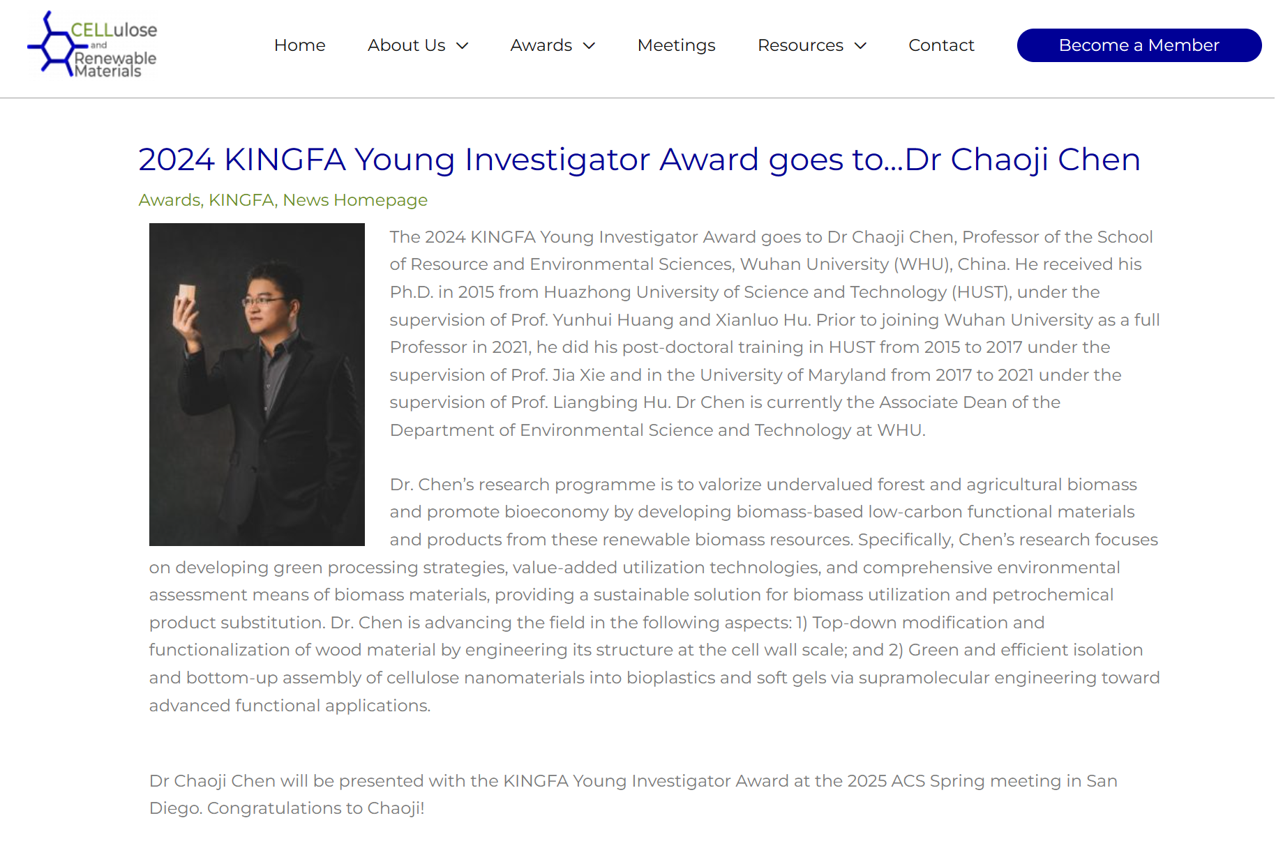陈朝吉教授获评这一奖项,也是国内首位获此奖项的青年学者。据悉,ACS KINGFA Young Investigator Award为美国化学会设置的纤维素与可再生材料领域全球最权威的青年学者奖项,旨在表彰青年科学家在纤维素及可再生材料科学与化学技术方面做出的杰出贡献。这是由ACS CELL部门奖项主席管理的年度奖项,成立于2016年,由金发科技赞助,每年3月份至8月份面向全球四十岁以下青年学者遴选一位予以表彰。2016年至今全球已有9位杰出青年学者入选。陈朝吉教授获此殊荣标志着业界同行对其在纤维素基低碳功能材料的多尺度结构设计、功能化及可持续应用研究的高度认可。据悉,陈朝吉教授2023年已获颁首届“中国化学会纤维素专业委员会青年学者奖”,此次获奖使其成为全球首位同时获得“中国化学会纤维素专业委员会青年学者奖”和“美国化学会金发青年科学家奖”的青年学者。