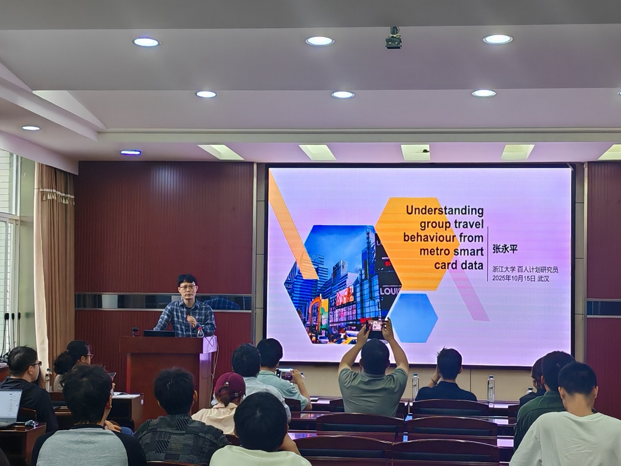 张永平博士是浙江大学公共管理学院 “百人计划” 研究员、博士生导师,兼任浙大 - 浙江移动数据智能与城市未来实验室副主任、Journal of Transport Geography编委,主攻智慧城市、数字治理、城市大数据与可持续交通研究。张永平博士的报告聚焦 “利用地铁智能卡数据理解团体出行行为”,以上海包含 1.2 亿次出行的地铁智能卡数据为基础,通过 “共存理论方法框架” 揭示群体出行与个人出行在时空上的差异,为交通管理、规划设计提供参考。