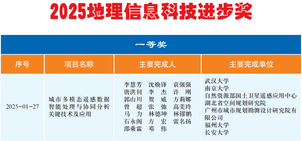 李慧芳教授、沈焕锋教授团队牵头完成的科研项目《城市多模态遥感数据智能处理与协同分析关键技术及应用》被授予2025年地理信息科技进步一等奖。本项目由澳门美高梅