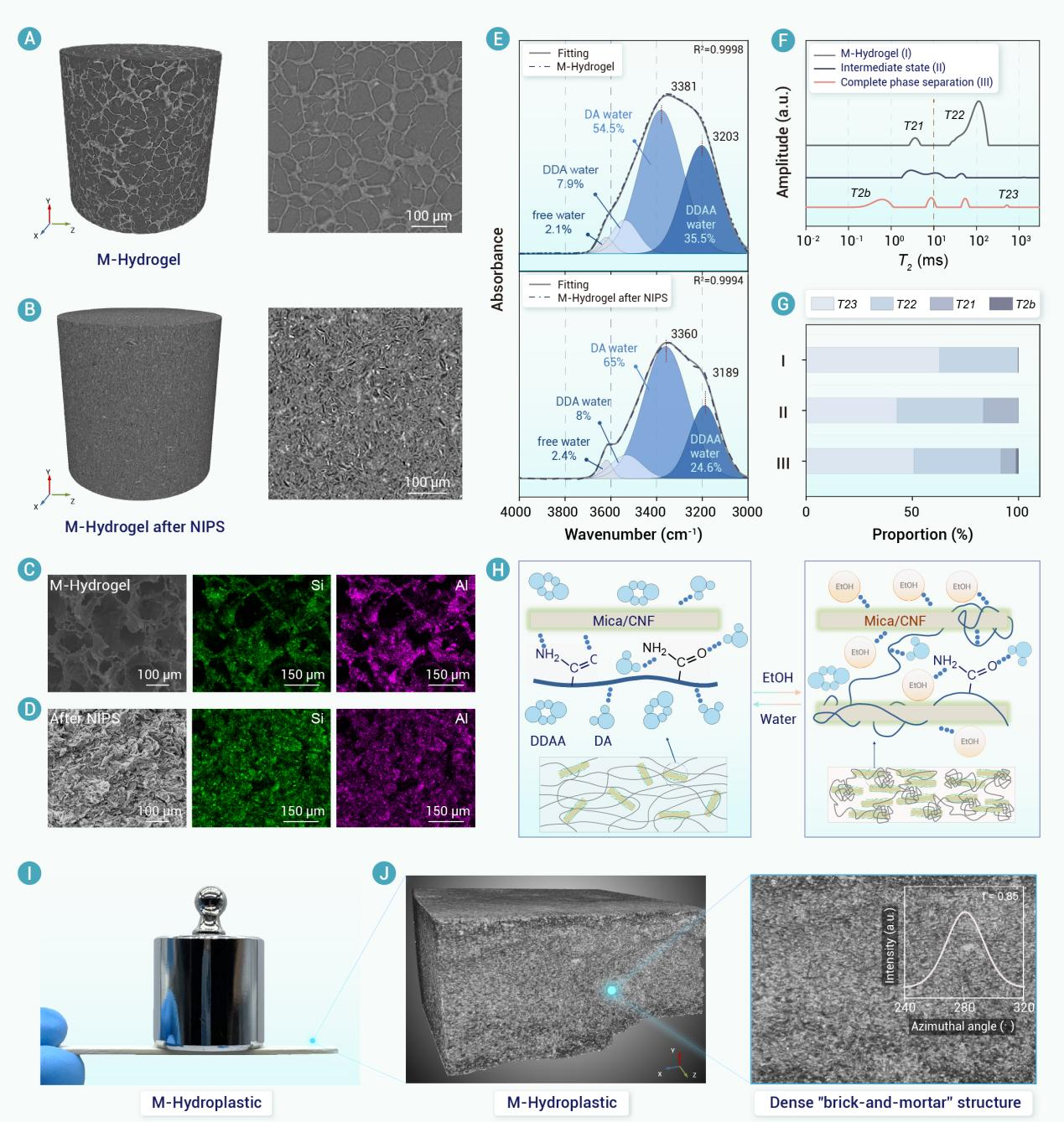 研究表明,随着乙醇进入体系,原有含水凝胶中的聚合物链发生重排,各组分之间的相互作用被进一步强化,促使内部结构迅速由疏松转变为致密。该过程伴随着组分间氢键作用、界面作用和多尺度结构重构的协同演化,使材料在温和条件下实现了由软凝胶向高强度块体材料的转变,也为其优异的力学性能和可塑成型能力奠定了结构基础。