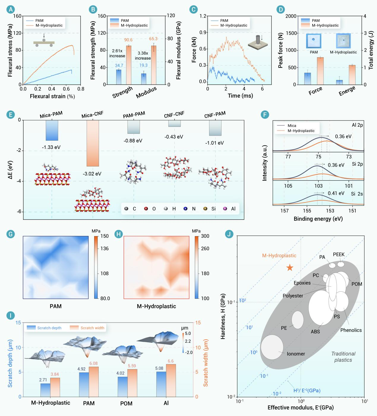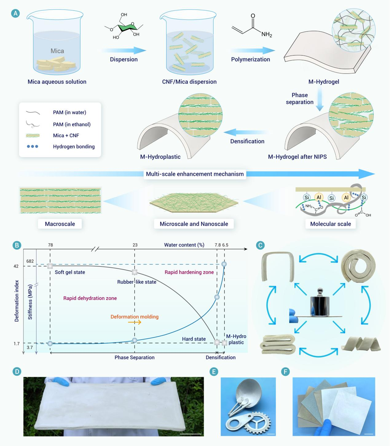 研究团队采用天然云母等矿物、聚丙烯酰胺(PAM)和纤维素纳米纤维(CNF)构筑含水凝胶体系,并进一步结合乙醇诱导的聚合物链重排与后续压制过程,实现材料内部结构的快速致密化和矿物片层的有序取向,最终获得兼具优异刚性与良好塑性成型能力的块体材料。这一过程的关键并不只是“将矿物粉末压制成型”,而是在相分离与致密化过程中实现了材料内部多尺度结构的协同构筑。分子尺度上,各组分之间形成强健的氢键网络,增强了体系的整体结合;纳米和微米尺度上,纤维素纳米纤维如同“胶水”,有效桥接矿物薄片;宏观尺度上,材料则进一步形成类似天然珍珠母的“砖—泥”层状结构,从而赋予体系优异的力学性能与结构稳定性。更具特色的是,这种材料能够随着含水状态变化,在“软胶态—橡胶态—硬固态”之间实现可逆切换。在适宜的中间水合状态下,材料具有较好的可变形能力,能够像塑料一样被弯折和塑形成复杂形状;随着进一步脱溶和结构致密化,材料转变为坚硬稳定的块体结构。不同于传统依赖加热软化、冷却定型的热塑性材料,该材料通过溶剂环境调控内部结构,建立了独特而温和的成型窗口,不仅可以实现多样化塑形成型,还能够被加工成餐具、汽车部件样式乃至蜂窝结构等复杂形貌,展现出优异的加工适配性和应用拓展潜力。