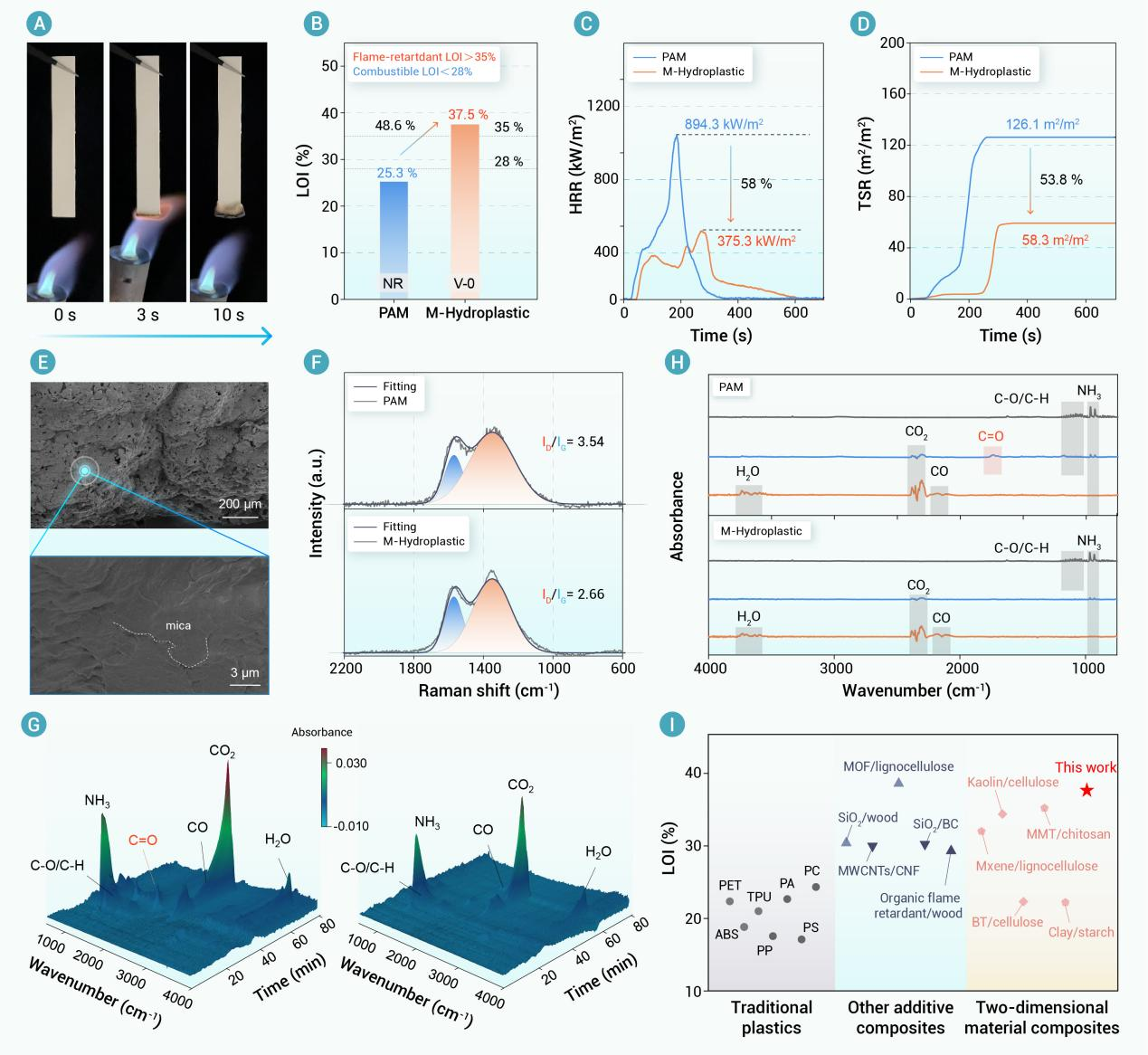 在阻燃方面,矿物水塑料在1300 °C丁烷火焰下能够快速形成保护性炭层,移开火源后迅速自熄;相比之下,对照材料会出现更明显的燃烧和形变。标准测试中,该材料的极限氧指数(LOI)达到37.6%,较PAM提高48.6%,并在UL-94测试中获得V-0等级。锥形量热结果还表明,其峰值热释放速率显著下降,烟释放也明显减少。这主要归因于矿物本身构成了隔热屏障以及在燃烧过程中形成的炭层与矿物共同组成保护层,抑制热量、氧气和可燃挥发物的传递。