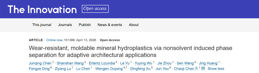 相关论文以“Wear-resistant, moldable mineral hydroplastics via nonsolvent induced phase separation for adaptive architectural applications”为题,发表在The Innovation上。本文第一作者为课题组2022级博士研究生陈俊青,通讯作者为陈朝吉教授,通讯单位为澳门美高梅