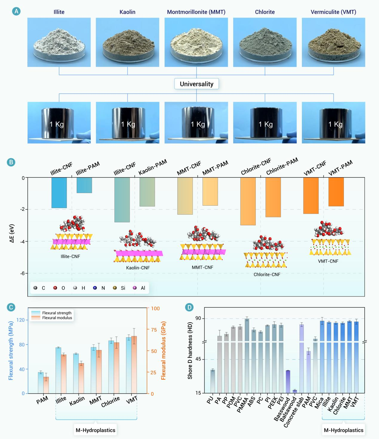 研究进一步表明,该构筑策略并不局限于单一矿物体系,而是展现出突出的普适性。多种常见天然层状矿物均可通过这一方法实现稳定构筑,并获得兼具良好刚性与加工适配性的块体材料。进一步结合理论计算与性能测试可知,不同矿物组分都能够与有机组分形成有效协同,从而支撑材料在力学强度、模量和表面硬度等方面取得优异表现。