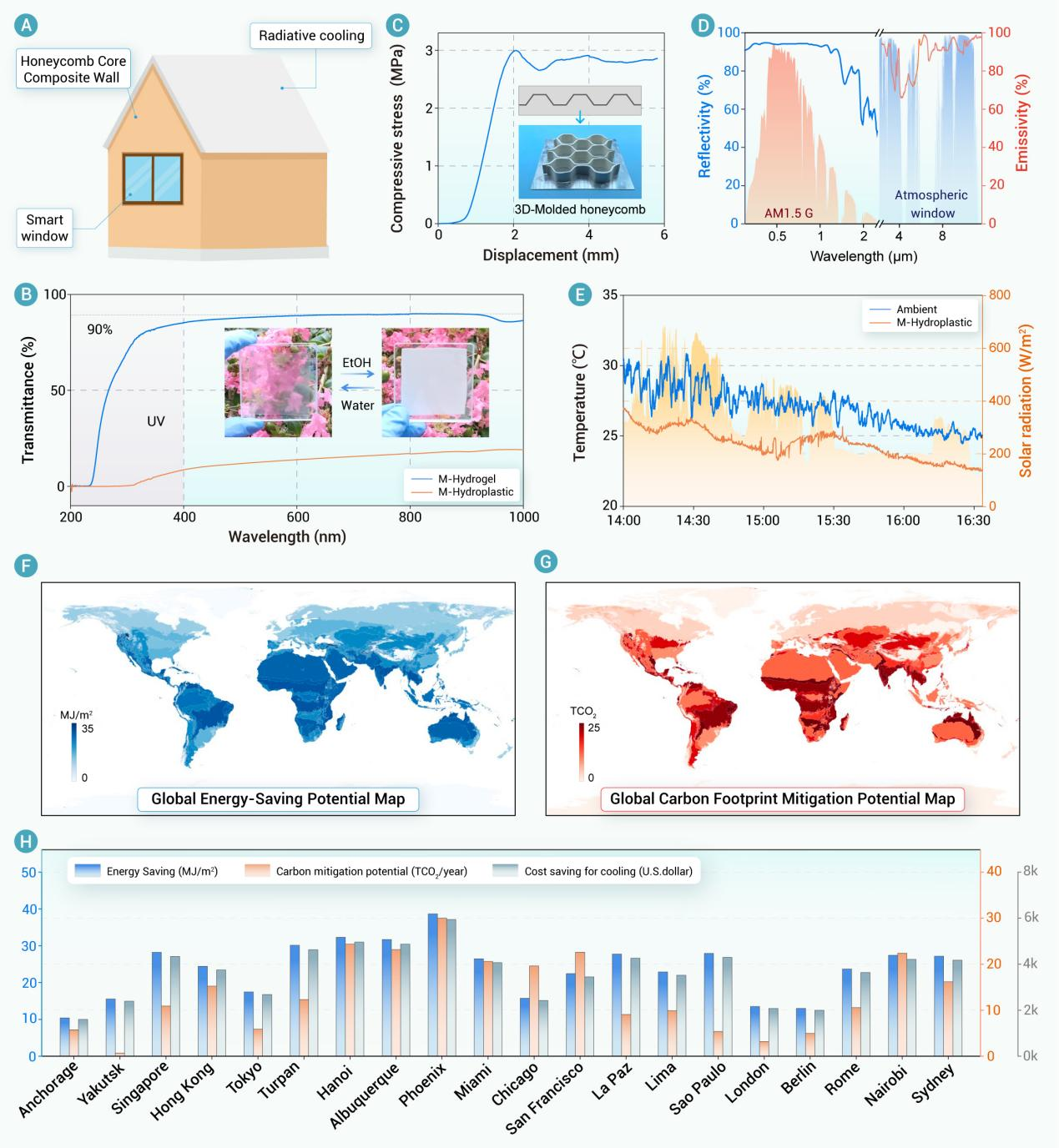 矿物水塑料不仅能做耐磨、阻燃的结构层,还可以通过改变矿物种类和结构设计,获得可调的光学、热学与辐射冷却性能。例如,当体系中使用方解石时,所得材料在太阳光谱范围内反射率可超过90%,并在中红外大气窗口中具有良好发射能力,这正是被动日间辐射冷却所需要的关键特征。在室外测试中,这种材料下方测得的温度平均比环境温度低2.6°C。进一步的全球模拟表明,在赤道和亚热带高太阳辐射区域,年节能可达35 MJ/m²;相应的碳减排潜力可达25 tCO₂/年,高温高湿地区的节能和降碳效果尤其明显。此外,该矿物水塑料的气候变化影响约为4.82 kg CO₂-eq/kg,优于不少常用结构材料,如PMMA、PC、玻纤增强塑料和铝等,显示出一定的减碳潜力。