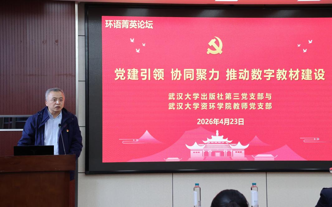 出版社吴江社长作主旨发言。他首先阐释了出版社长期坚守的核心理念——“服务高等教育,传播先进文化”。他指出,出版社始终致力于传承学术薪火、服务教学一线,通过出版高质量教材推动学科知识的系统传播。面对教育数字化浪潮,出版社积极响应国家战略和学校部署,大力推进数字教材建设,他期待与资环学院教师团队深度合作,共同开发一批高质量的数字教材,真正实现教材编写与课程使用的一体化融合。