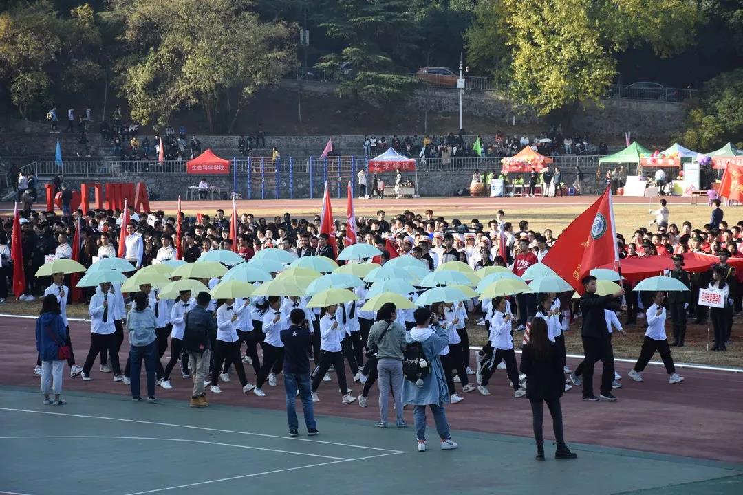 党委书记刘兴国老师,党委副书记冯丹老师出席了开幕式。伴随着激昂的《运动员进行曲》,各院系的运动员依次入场。常言道:“好饭不怕晚,叙话不怕慢”,压轴出场的资环方阵不负众望,整齐的步伐,有力的摆臂,响亮的口号……无不体现着资环学子昂扬向上的精神面貌。在“腾蛟起凤,放马金鞍”的口号之后,一把把黄色或绿色的伞同时打开。一个大大的“RE”(Resource and Environmental Sciences),彰显了资环的风采。