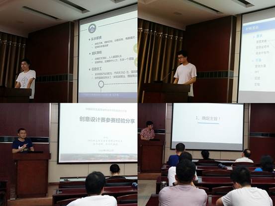 包文韬分享了技术挑战赛参赛经验。他从报名组队、擂台赛、第三方验证、决赛答辩等四个方面详细介绍了技术挑战赛的整个流程。他认为,通过注意细节,做好规划,再加100%的努力,才有可能取得成功。结合参加创意设计赛自由选题的参赛经验,林中正讲述了前期材料的准备,以及如何撰写这些材料才能脱颖而出。他分享了答辩环节的技巧,特别强调提前模拟答辩会起到事半功倍的效果。许刚介绍了创新设计赛政府命题、企业命题和自由选题这三种选题的基本情况,对比分析了三类选题的侧重点并详细介绍了政府选题。通过对比,他向大家展示了近几年命题的内容,并号召大家结合自己的专业知识和研究方向积极参加比赛。王雪冰以诙谐幽默的语言,分享了他参加创意设计赛的参赛经验。他强调了参加比赛的理由:一是有经历,二是参赛内容跟大家的专业非常相关,三是校院高度重视。