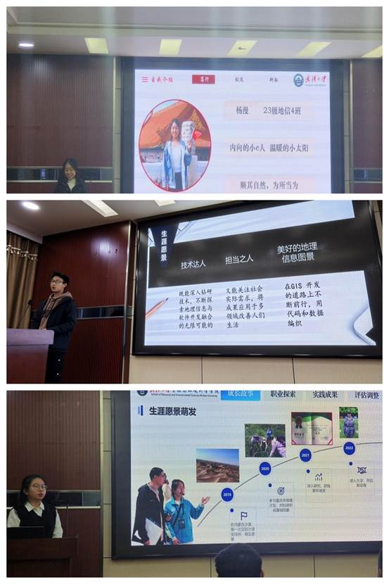 23级地理信息科学的王艺锦,她提到与地理信息工程师这一职业目标的渊源,始于一次又一次对地信专业的了解以及在学科竞赛中逐渐了解地理信息工程师的魅力,并决心为之奋斗。23级环境工程专业的申欣然,梦想成为一名专业的环境工程师,专注于环境污染治理与生态保护。23级弘毅地理科学的石灵奇,她的人生信条是“扎根希望田野,积蓄向上力量”,她希望博士毕业后进入国家地理信息中心、中国科学院地理科学与资源研究所等机构,从事基础研究和应用开发工作。
