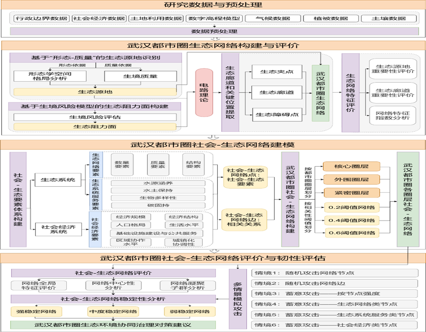 分析组一等奖作品《武汉都市圈社会-生态网络构建与韧性评估研究》的获奖团队由本科生戚皓智、颜怡乐和张倩组成,刘殿锋担任指导老师。作品以武汉都市圈为案例区,在改进传统的生态网络分析框架基础上,整合生态网络、生态系统服务与社会经济系统之间复杂的相互作用关系,以创新的都市圈视角构建武汉都市圈社会-生态网络,并通过复杂网络测度方法分析社会-生态系统的交互关系和网络稳定性的关键影响因素,为优化自然资源利用与管理模式,制定有效的国土空间生态保护和修复政策提供依据,促进武汉都市圈社会经济与生态环境协调发展。