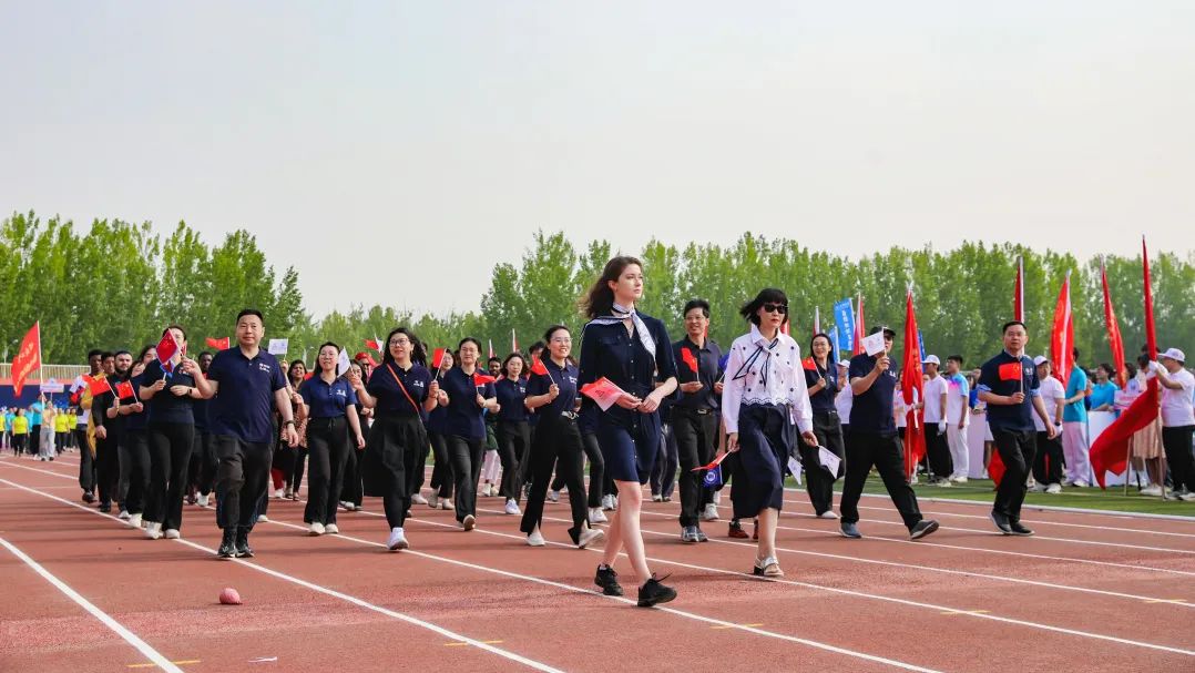 中外教师方阵同样引人注目,国际范十足。手中小旗随步伐汇聚成浪——红的国旗、蓝的校旗、白的院旗交织闪烁,不同肤色的笑容在春风里同频共振。