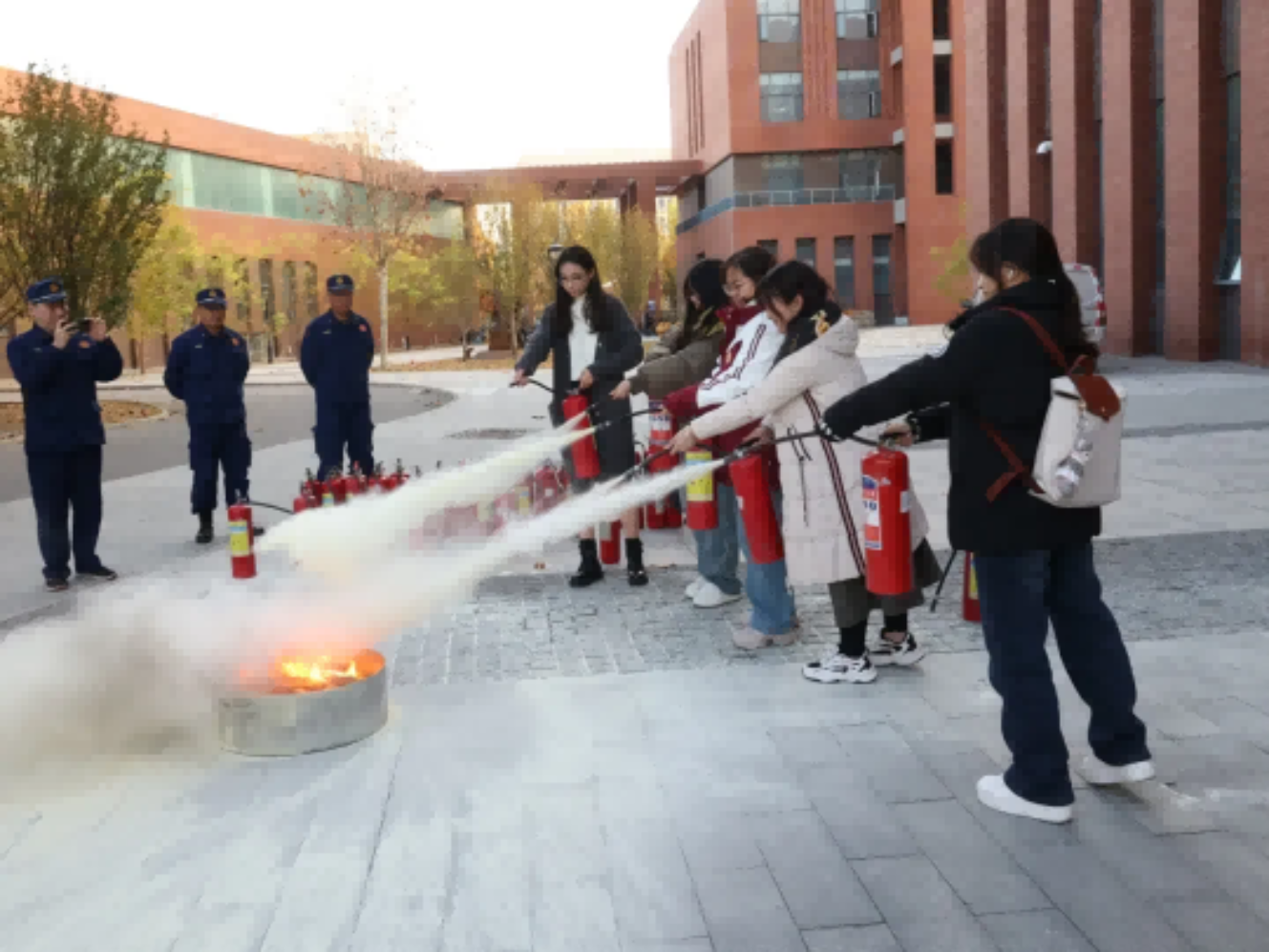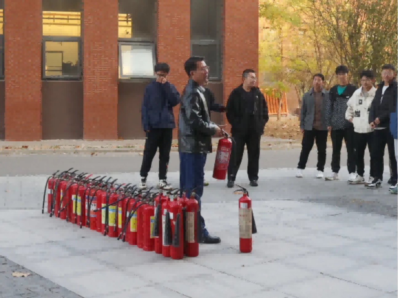 讲座尾声,吕老师带领同学们到户外安全区域,示范两种常见灭火器使用方法,并邀请同学们进行实操体验,确保大家在面对火灾时能够沉着应对、正确处置。