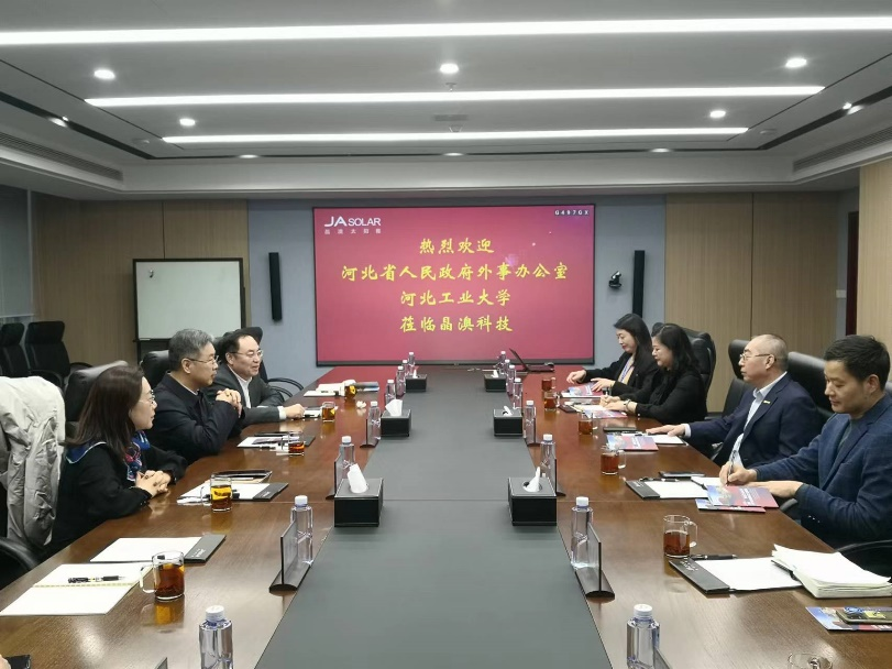 马国伟对晶澳科技的热情接待表示感谢、对河北省政府外事办在学校国际化办学中给予的大力支持表示感谢。他详细介绍了澳门美高梅 的前世今生,学校在办学历程中创造了多个“第一”:第一个培养工业人才的学校、第一个校名出现“工业”的大学。在介绍学校国际化办学时,他指出,学校坚持“引进来、走出去”的国际化办学理念,成为在发达国家办校区的先驱者,与世界前100的名校合作成立澳门美高梅 ,致力于高层次、最优质的国际化人才培养,取得了初步成效,成为中国北方国际化办学最好的高校之一。他还介绍了学校开展的“有组织科研”的模式及取得的巨大成效。