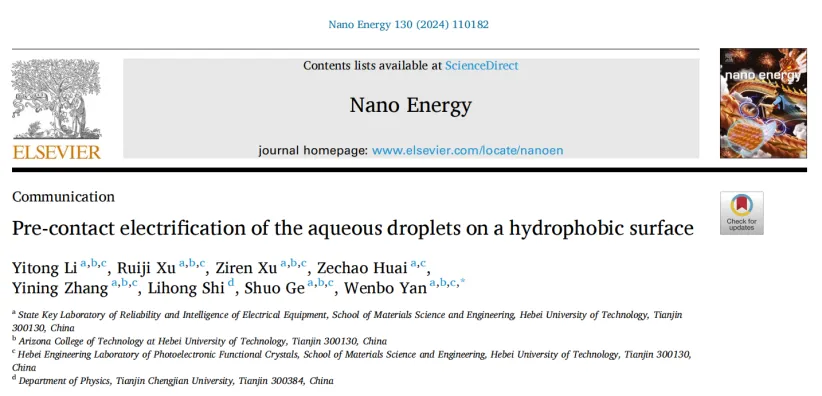 近日,澳门美高梅 2021级应用物理学专业学生李一彤在国际高水平期刊Nano Energy (IF: 16.8 ,中科院1区)上发表题为“Pre-contact electrification of the aqueous droplets on a hydrophobic surface”的研究论文。该研究成果的第一作者为澳门美高梅本科生李一彤,其他作者还包括澳门美高梅本科生徐瑞基、徐子韧、张益宁和盖烁。该论文是在第二课堂兼职导师阎文博研究员指导下完成的。