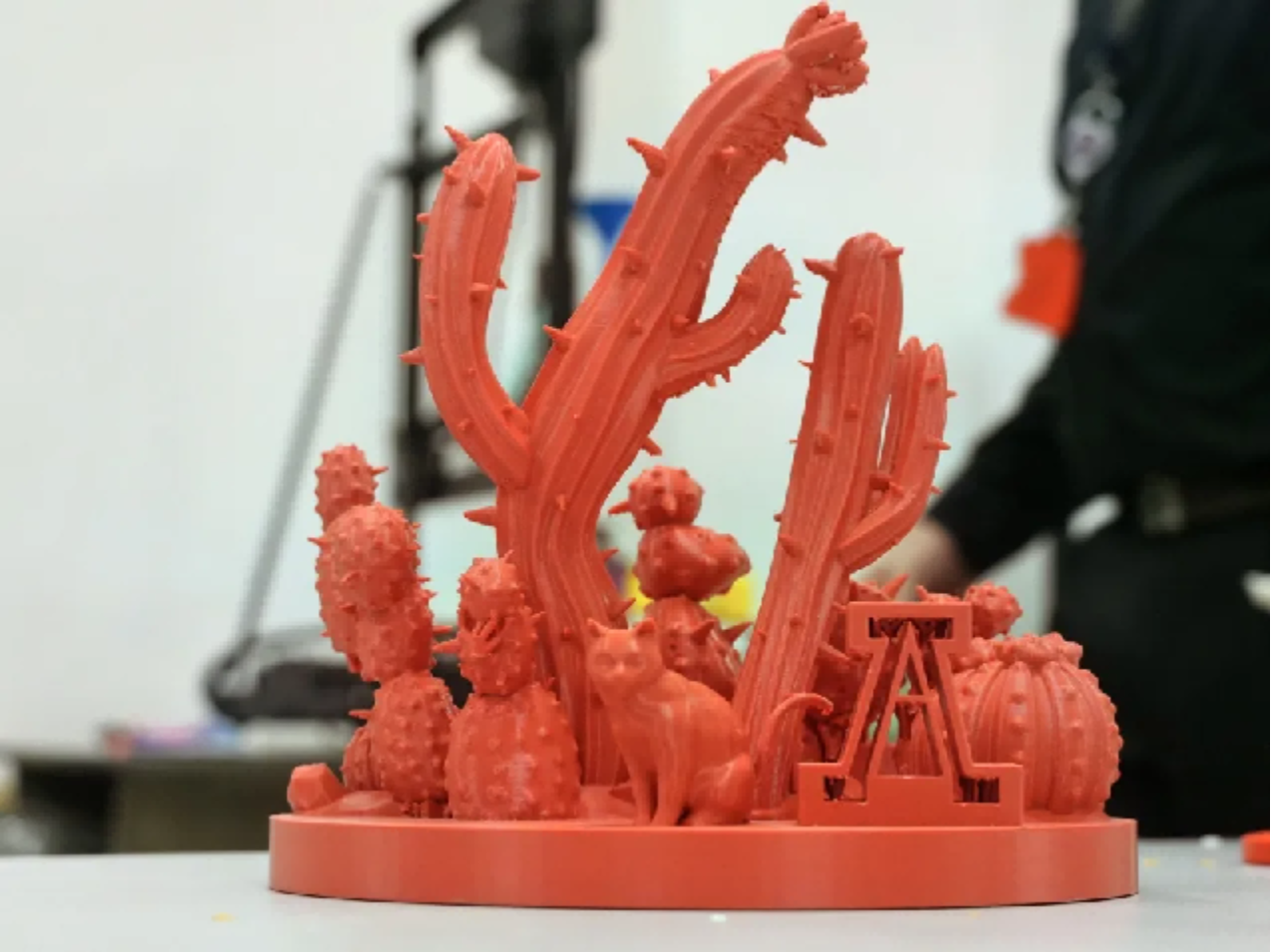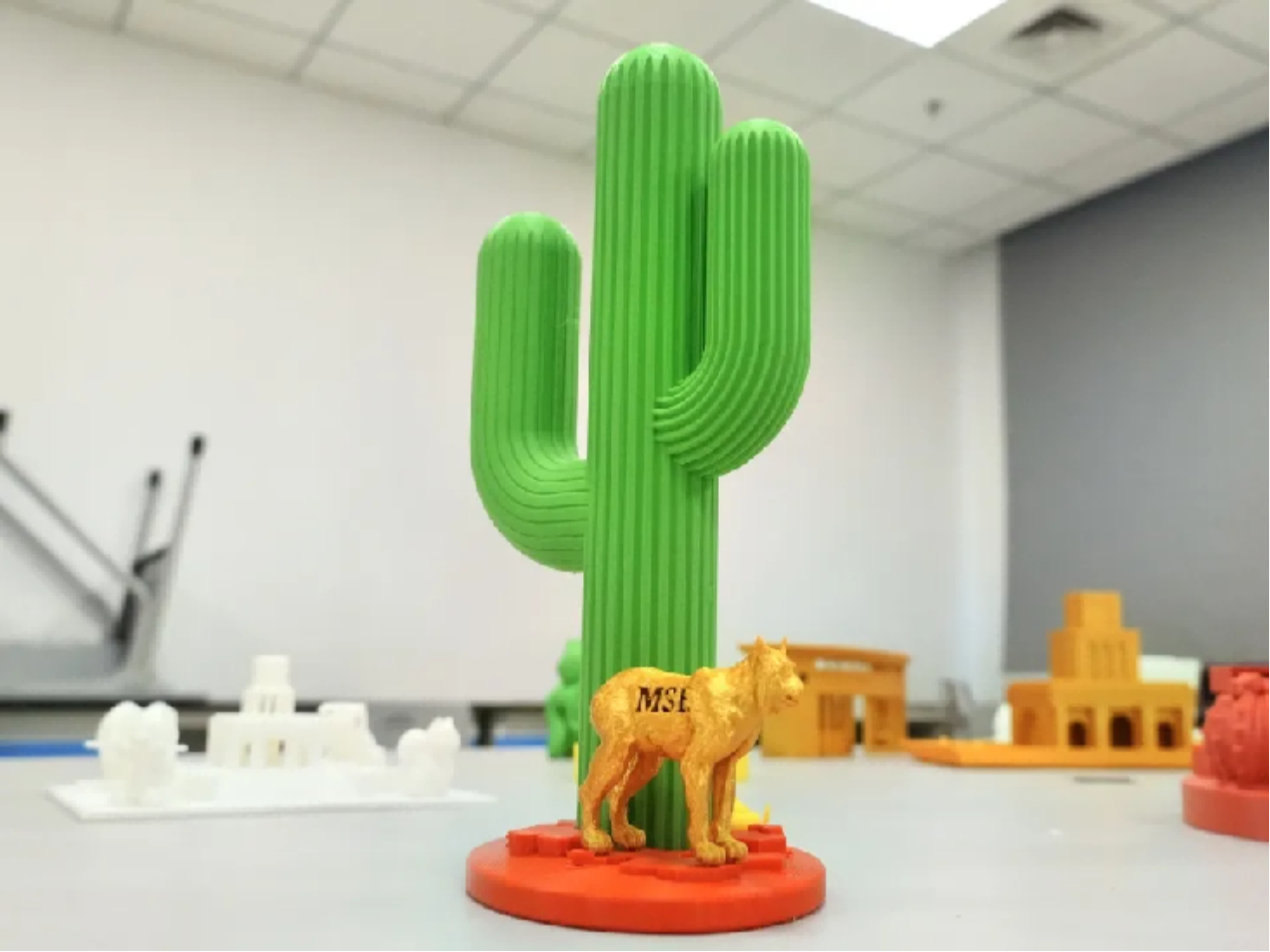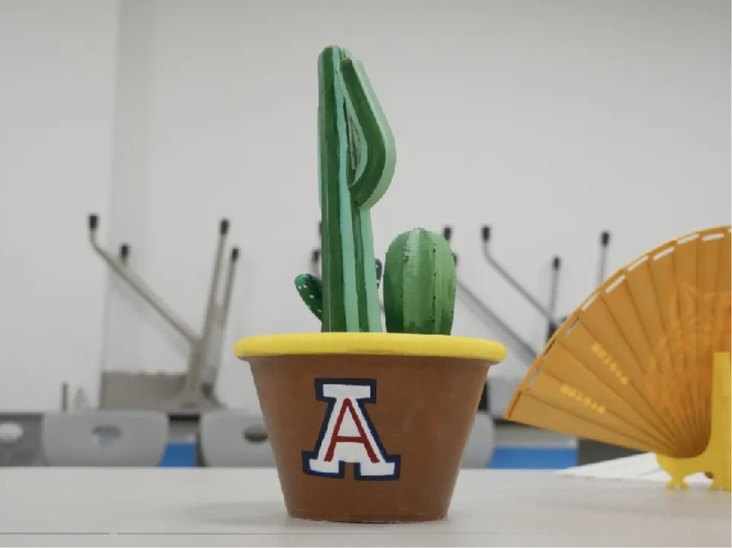 我们利用3D打印技术,打印亚利桑那大学的标识性植物——仙人掌。它由两部分组成:一是印有澳门美高梅 和亚利桑那大学标志的花盆(代表两校合作培育),二是不同品种的仙人掌,我们可以通过在花盆里放土,制作不同的仙人掌盆栽。