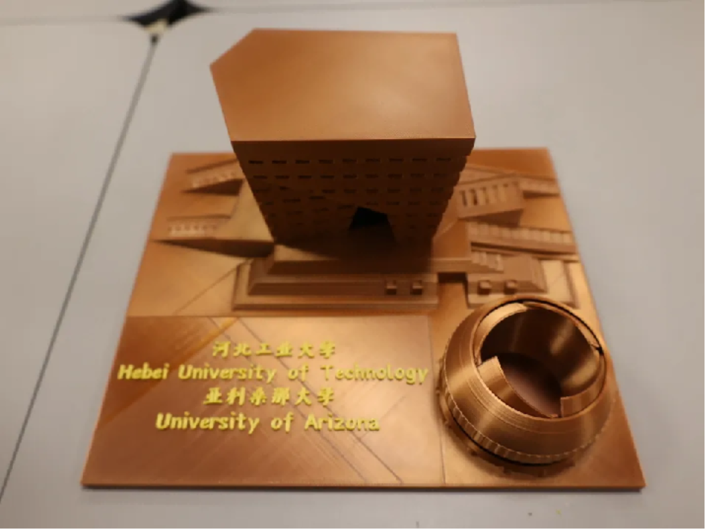 作品主题是一个正方体相框,可以变换不同的光影相片,我目前放在上面的是亚工澳门美高梅楼主楼以及亚利桑那大学主楼。这是合作办学学校的地标性建筑。
