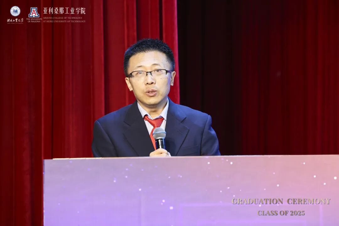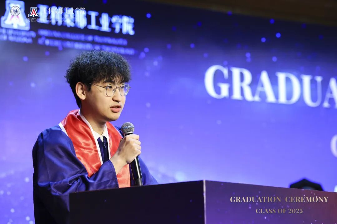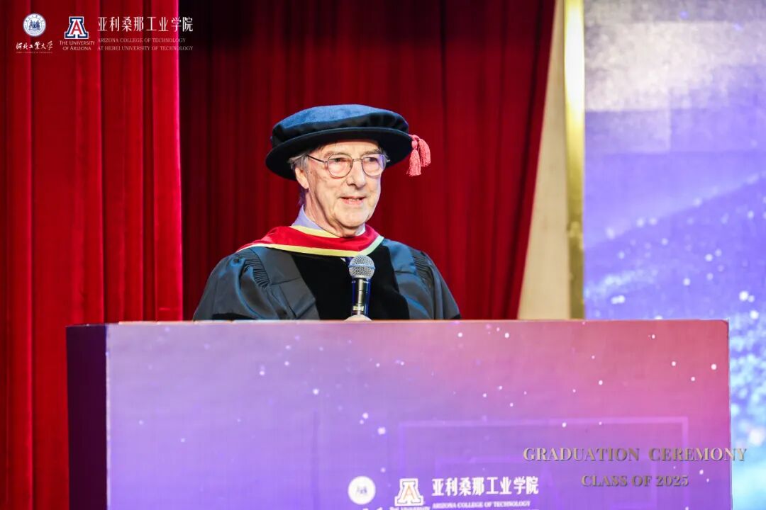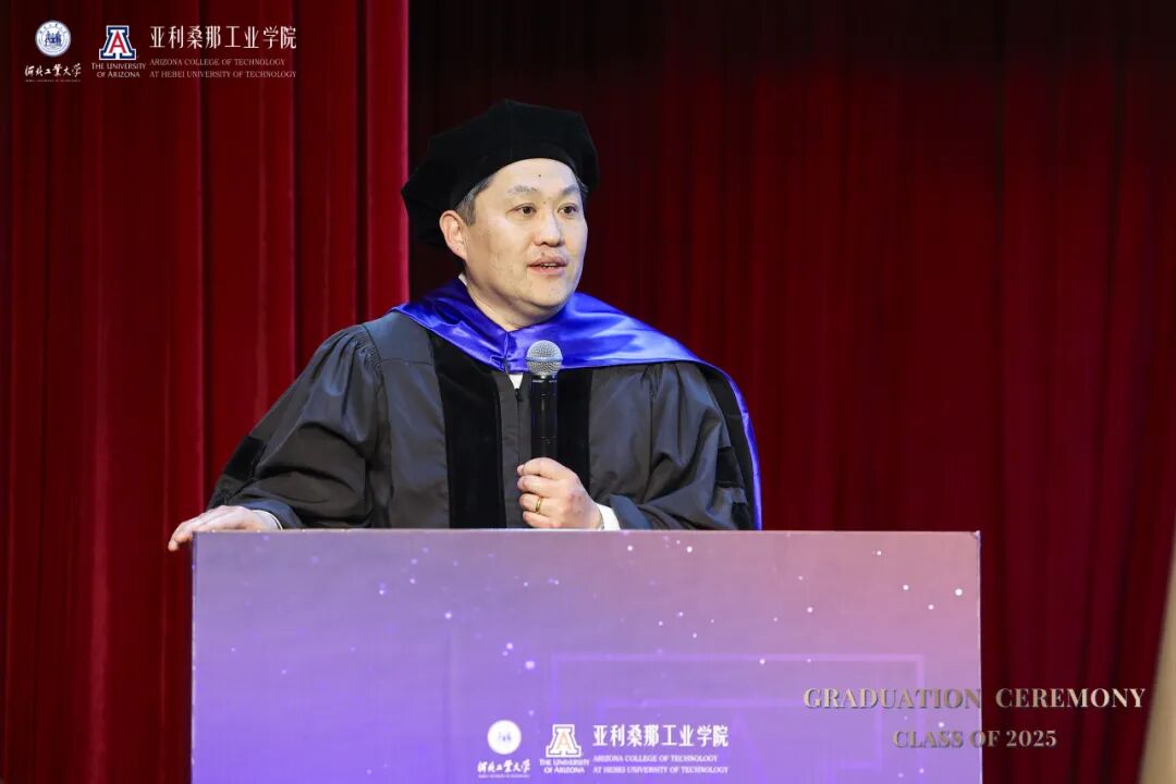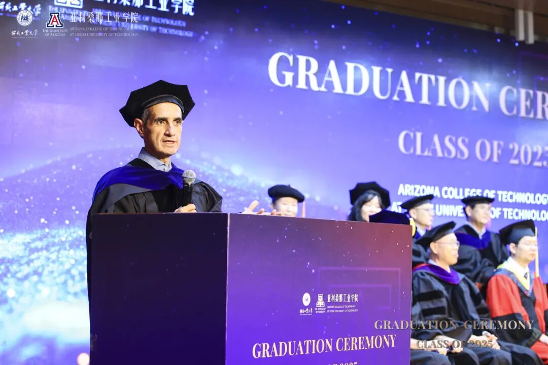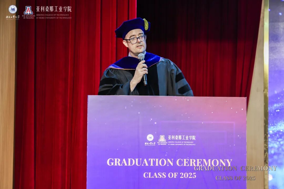 教师代表亚利桑那大学航空与机械工程专业教授Richard Stehle对毕业生表示祝贺。他指出,首届获得中美两校学位的学生,他们在融合中西教育理念的培养模式下成长,具备独特的全球视野与综合素养。他鼓励同学们要勇敢面对失败,把挫折转化为进步的阶梯,积极面对未来挑战,运用所学创造属于自己的精彩未来。